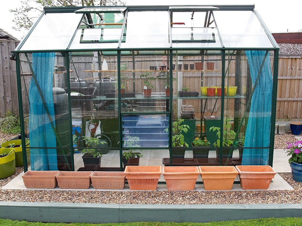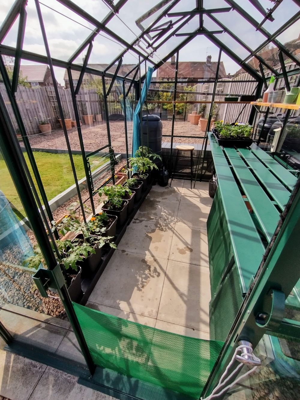 But I have earth on one side for planting into and I put trestle tables on that to put all my baby plants to increase the space. Mine is polycarbonate which doesn't stay as pristine as glass and sometimes blows off in a gale. But I think I'm not as tidy a person as you.