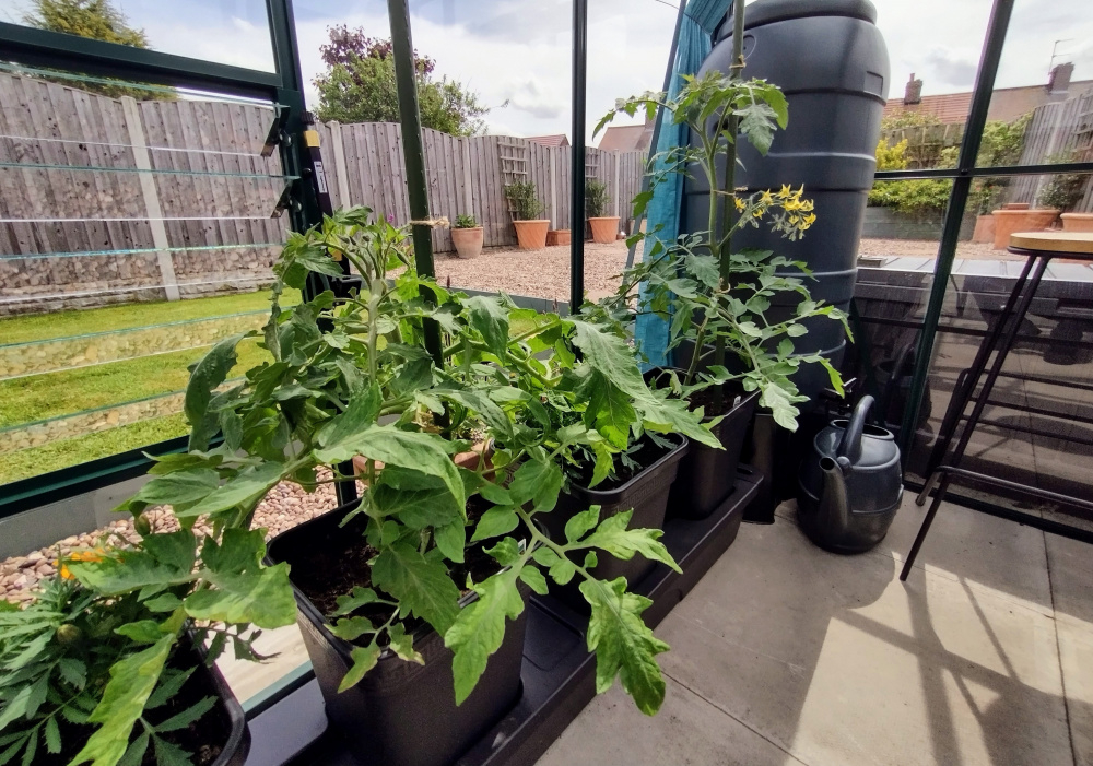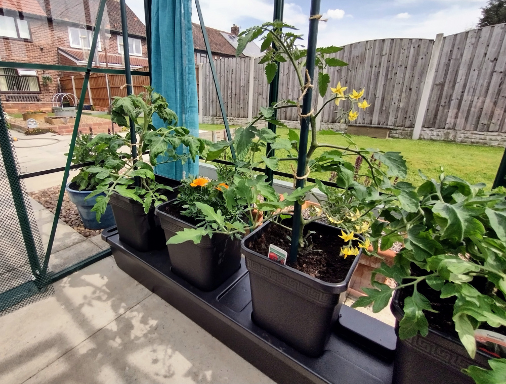 With the recent warm weather the toms are growing really well, the Sweet Million 100 is rocketing up, even the Ailsa Craig which is by the door has come to life.
