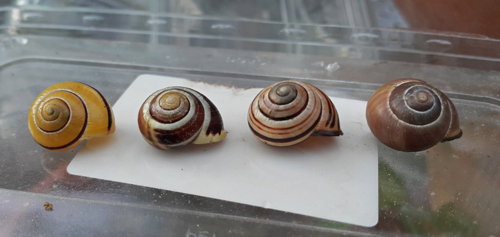 This is a small sample from my garden. All the same species. You can see that the yellow one on the left has a damaged lip so there's no colour and the next one along has a white lip but is actually a brown-lipped snail. The other two have the classic brown lip.