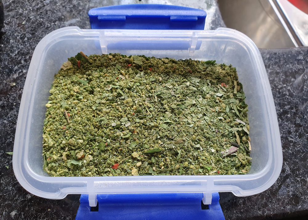 I hope the police don't find my stash This is my experimental snail food mix made from nettle, dandelion, a few herbs, some dried mealworms, powdered egg shell, a couple of dog biscuits, some sunflower and pumpkin seeds, and some goldfish food. All ground up in a pestle and rehydrated as needed. The snail hoovers this stuff up so I'm going to make a supply to see me through the winter. I'll have a good supply of fresh food for now but the leaves dry out well in the greenhouse in this hot weather so I'll be getting a supply sorted while I can.