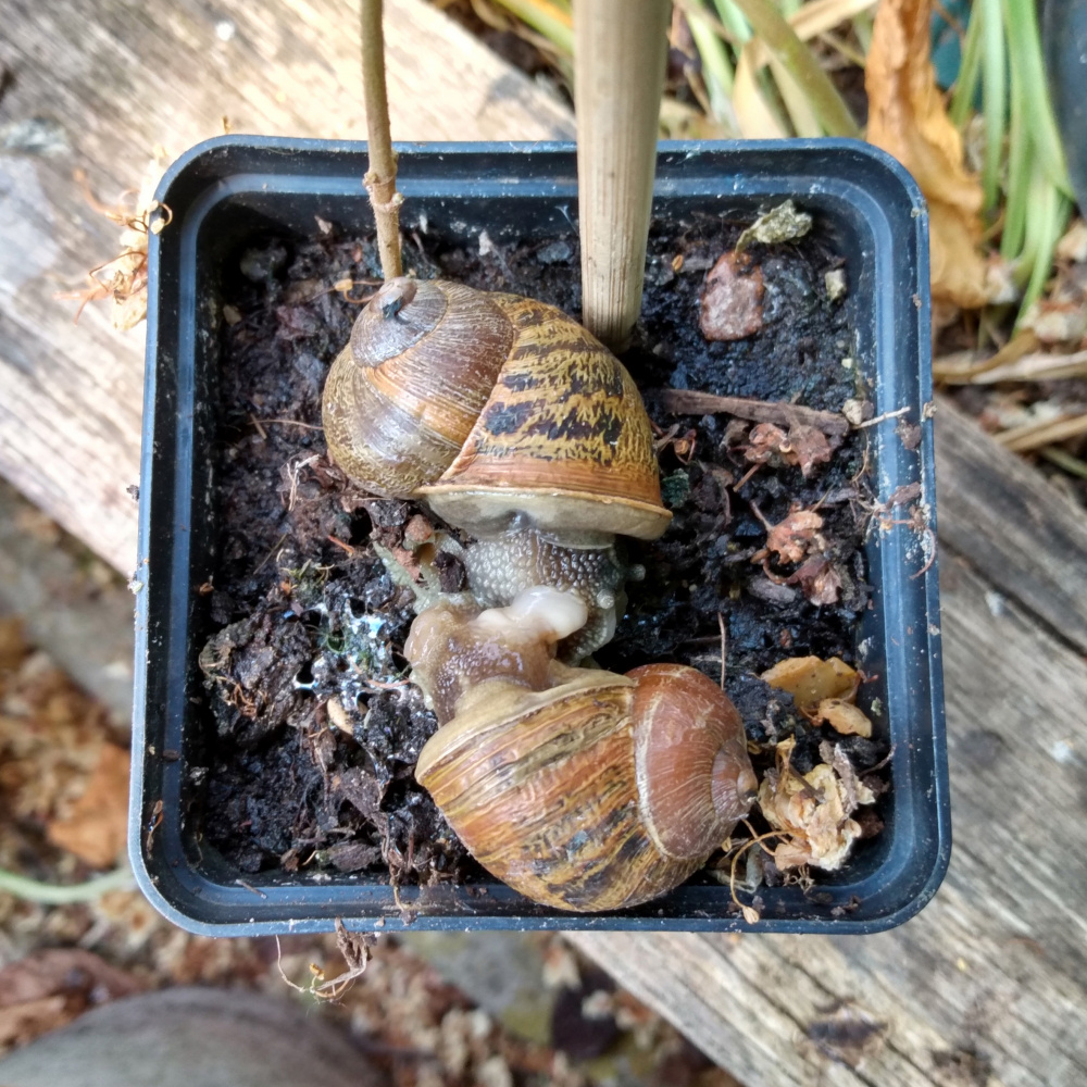 No eggs that I've found. I was reading a list of things these snails eat and I can see why they'd be an environmental disaster in some places. I fed him some bits of red pepper a couple of weeks ago and found pepper plants growing in the tank yesterday. He's eaten them now but I might sow some more seeds in there as easy grazing.