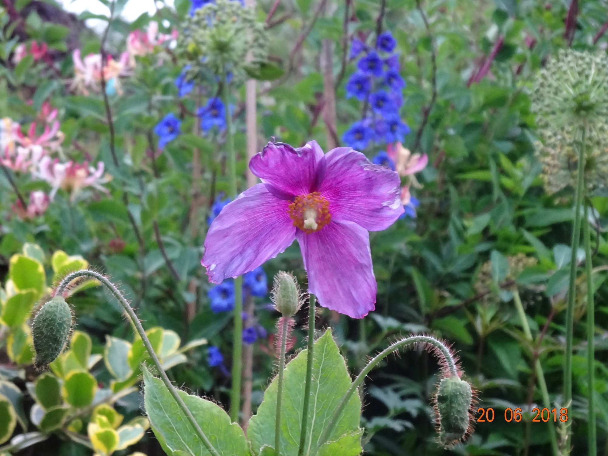 Part of West mixed border in full bloom. The plume poppy has grown quite tall this year; Jackman's clematis climbing into the wisteria (and pittosporum 'tobira' on the right, etc.