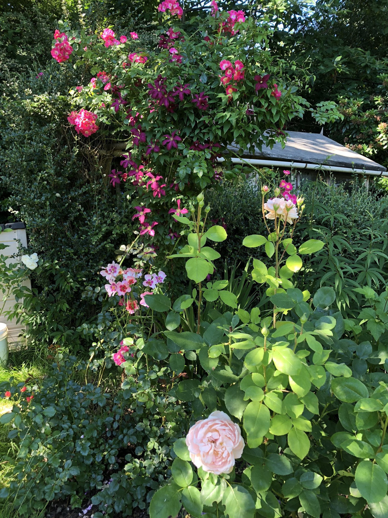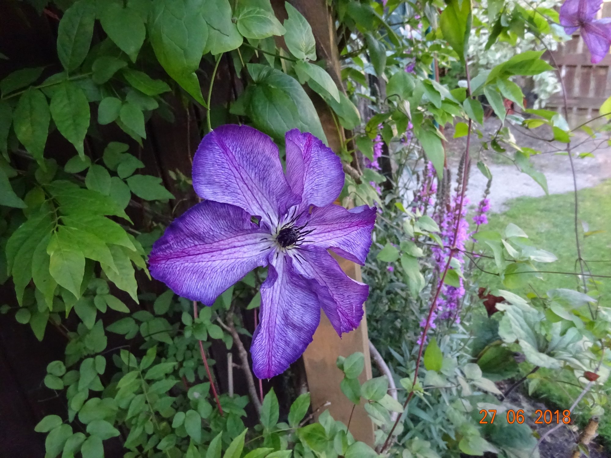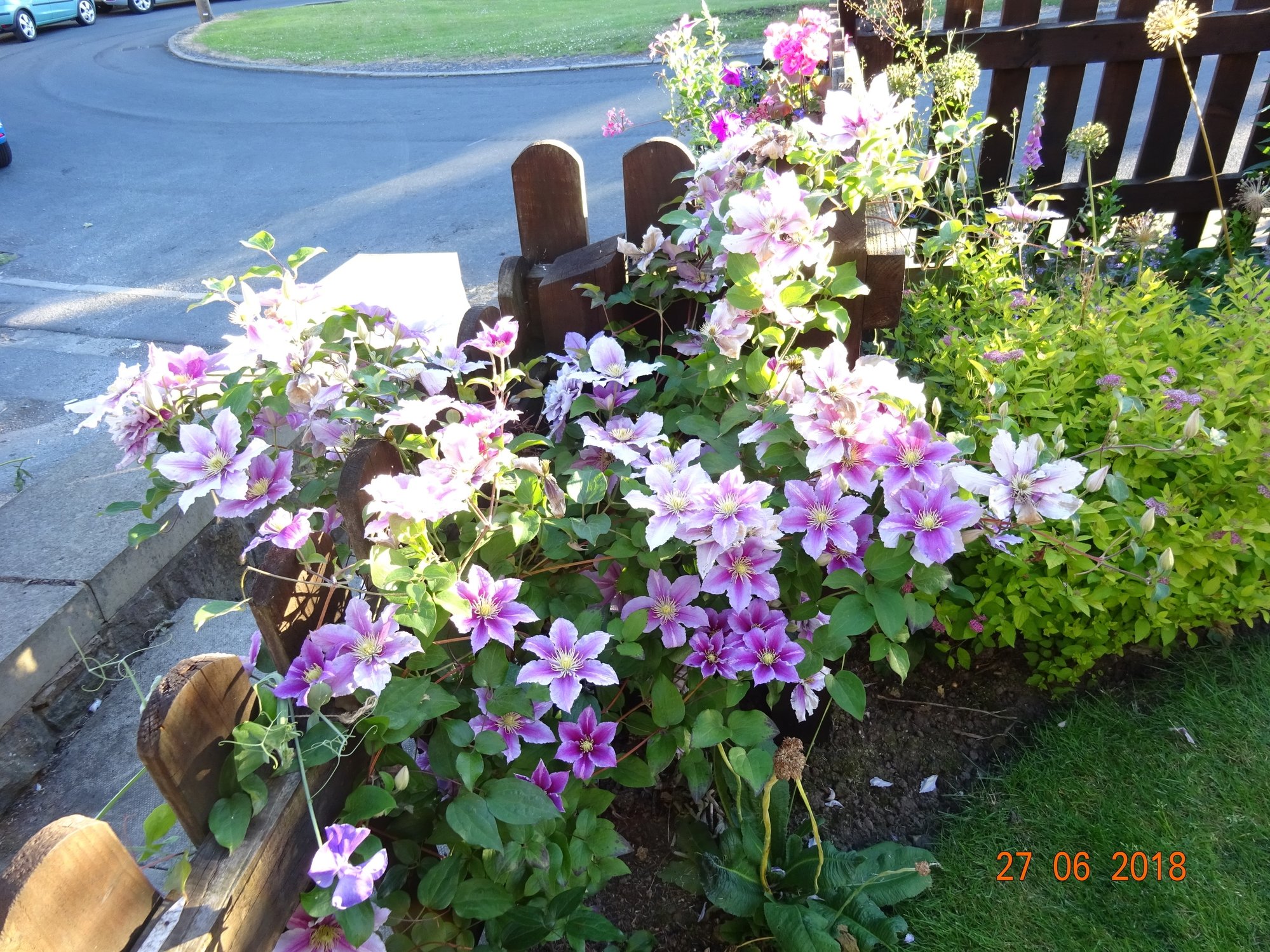 Clematis 'Saphyra Double Rose'spreading all over the place (it does not like climbing) and angel’s fishing rod just starting to bloom on the right.