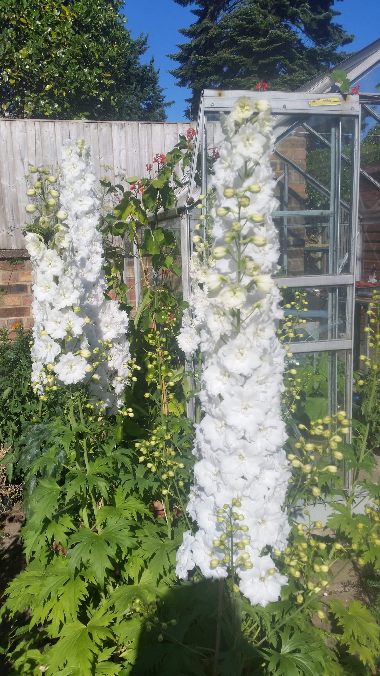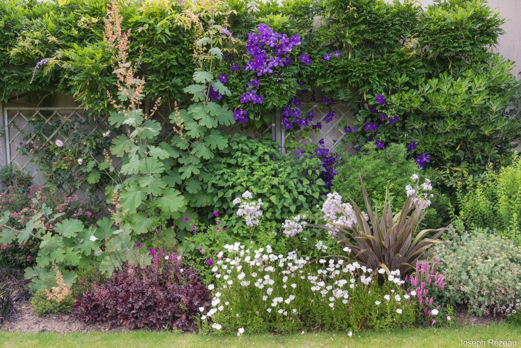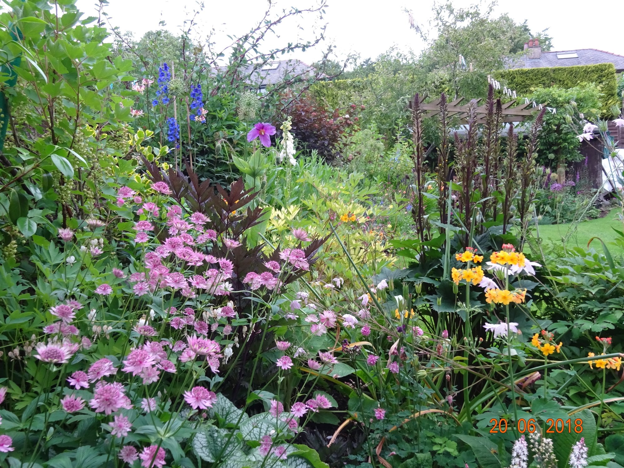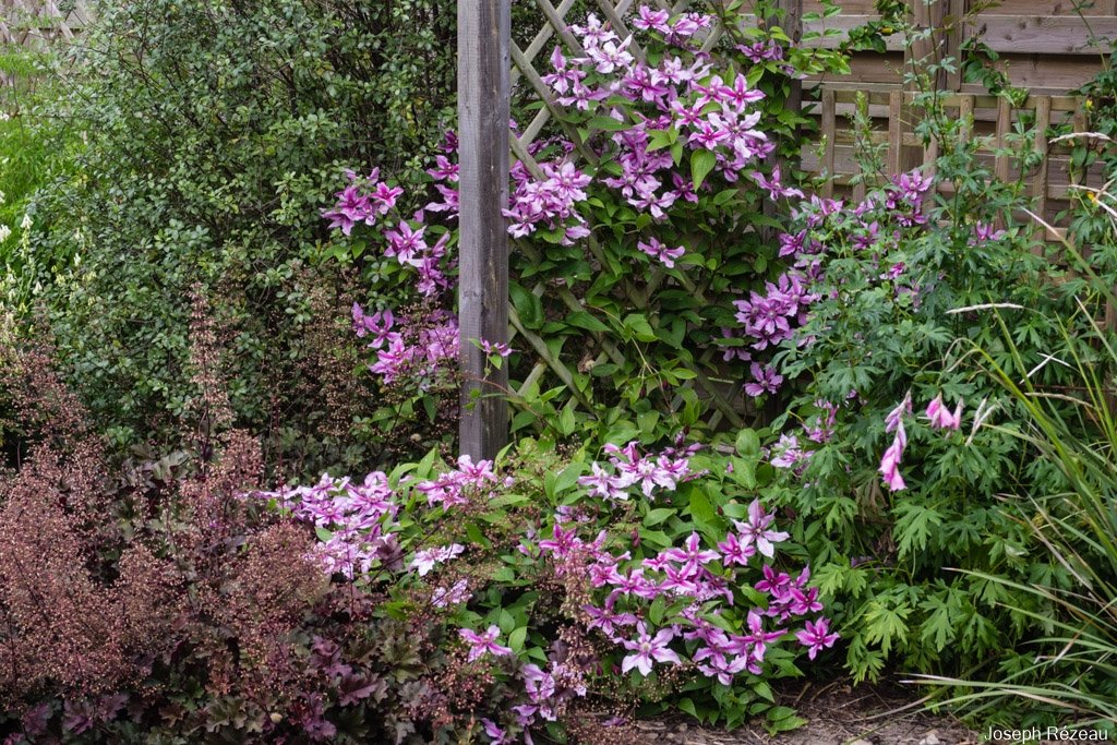 Clematis 'Saphyra Double Rose'spreading all over the place (it does not like climbing) and angel’s fishing rod just starting to bloom on the right.