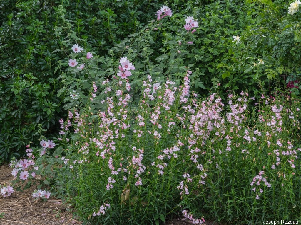 Color association (pink) of tree mallow 'Barnsley' and penstemon 'Apple blossom'