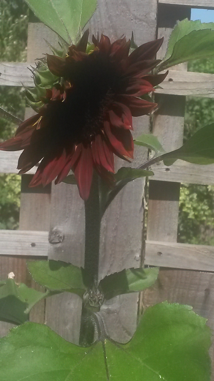 @Fire this one's for you. My first claret sunflower . But it's a weird one - multiple blooms , even in the leaf axils. The rest are bog standard and nowhere near blooming .