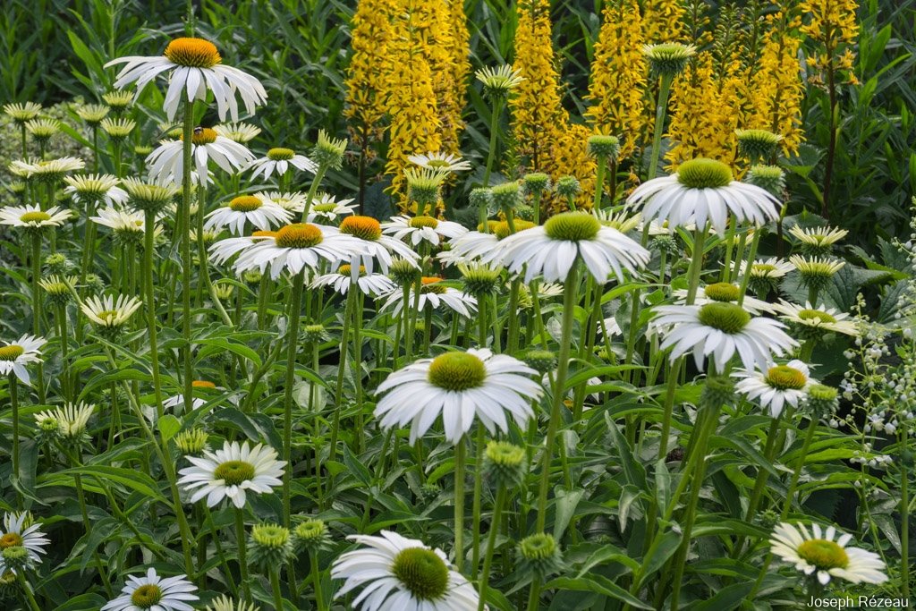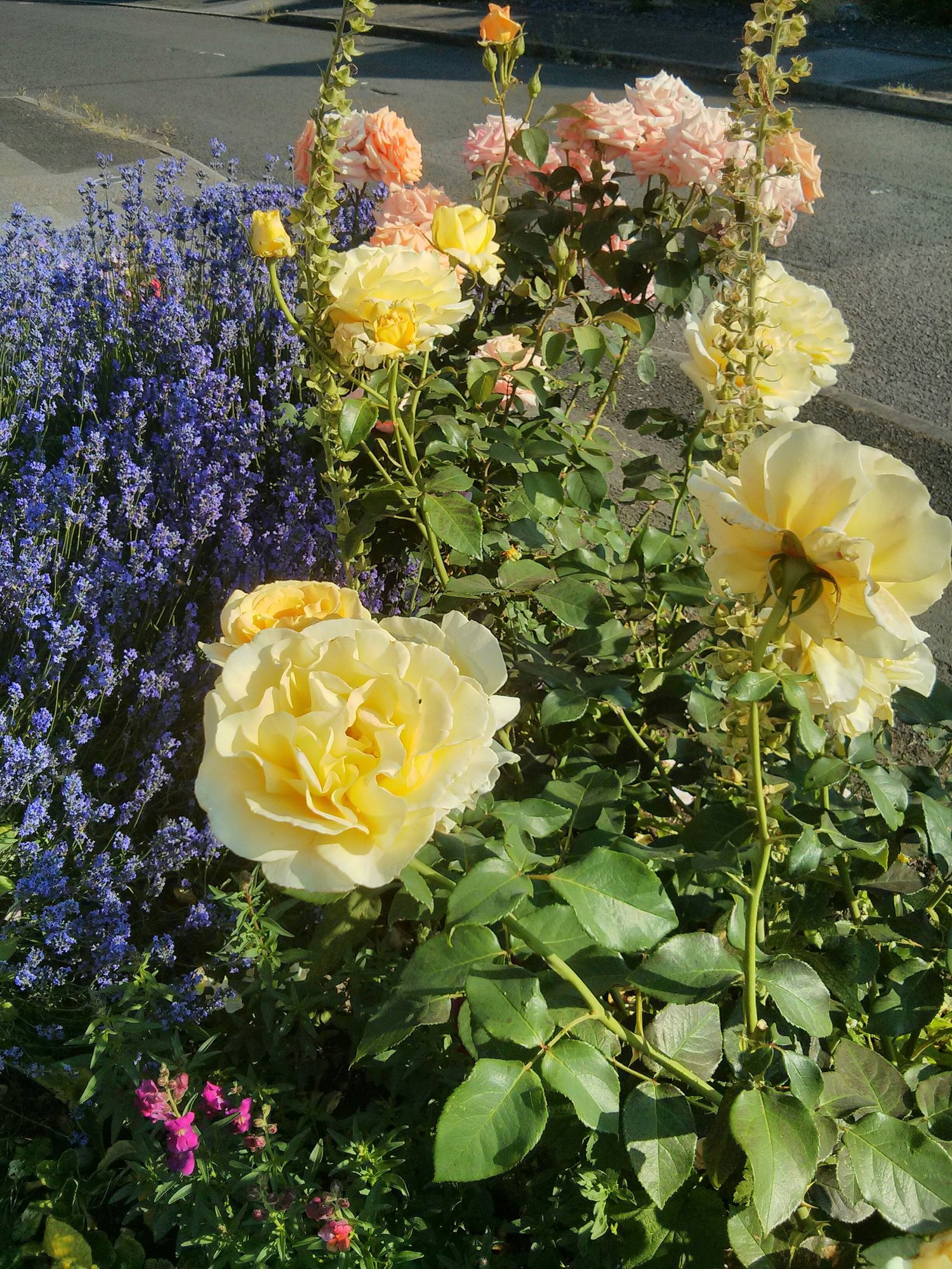 Comtesse de Bouchard with climbing rose Masquerade to the right and left.