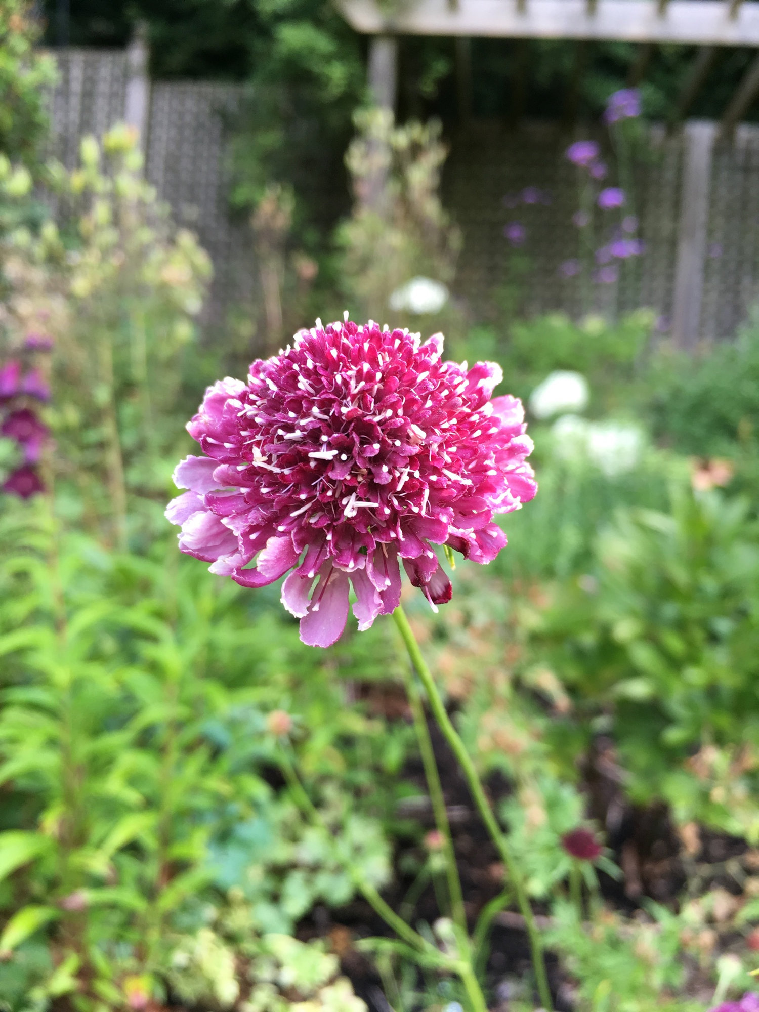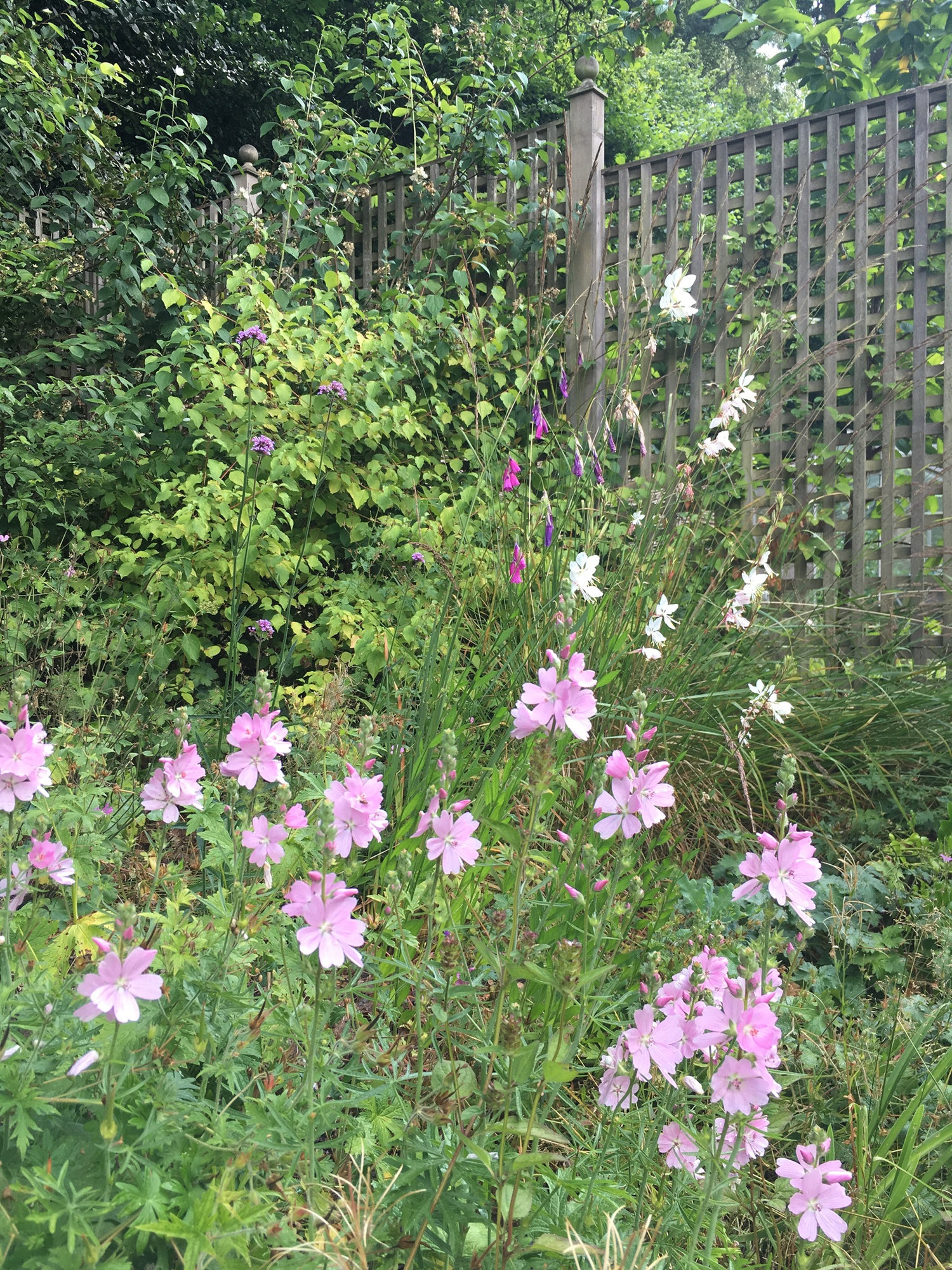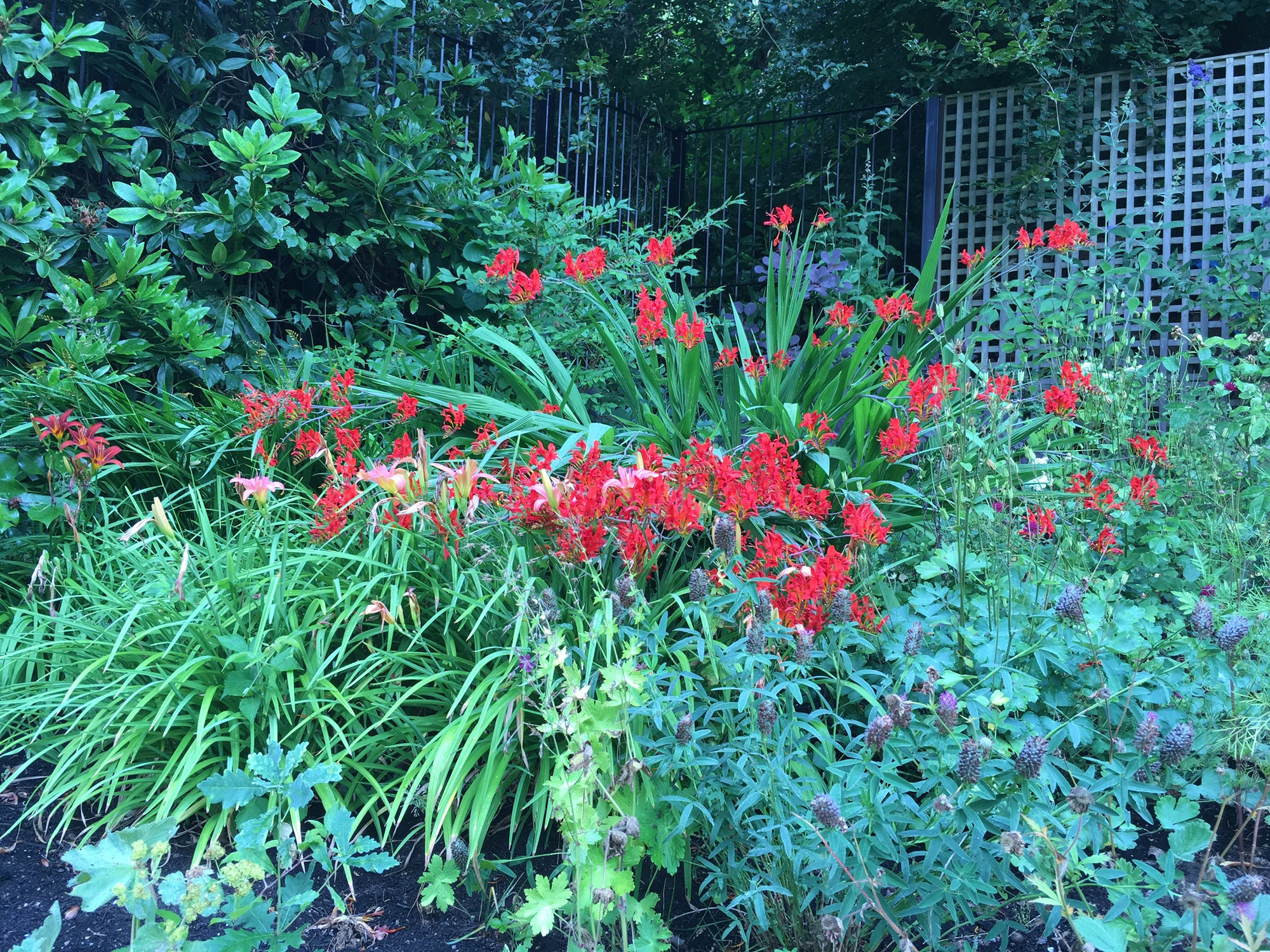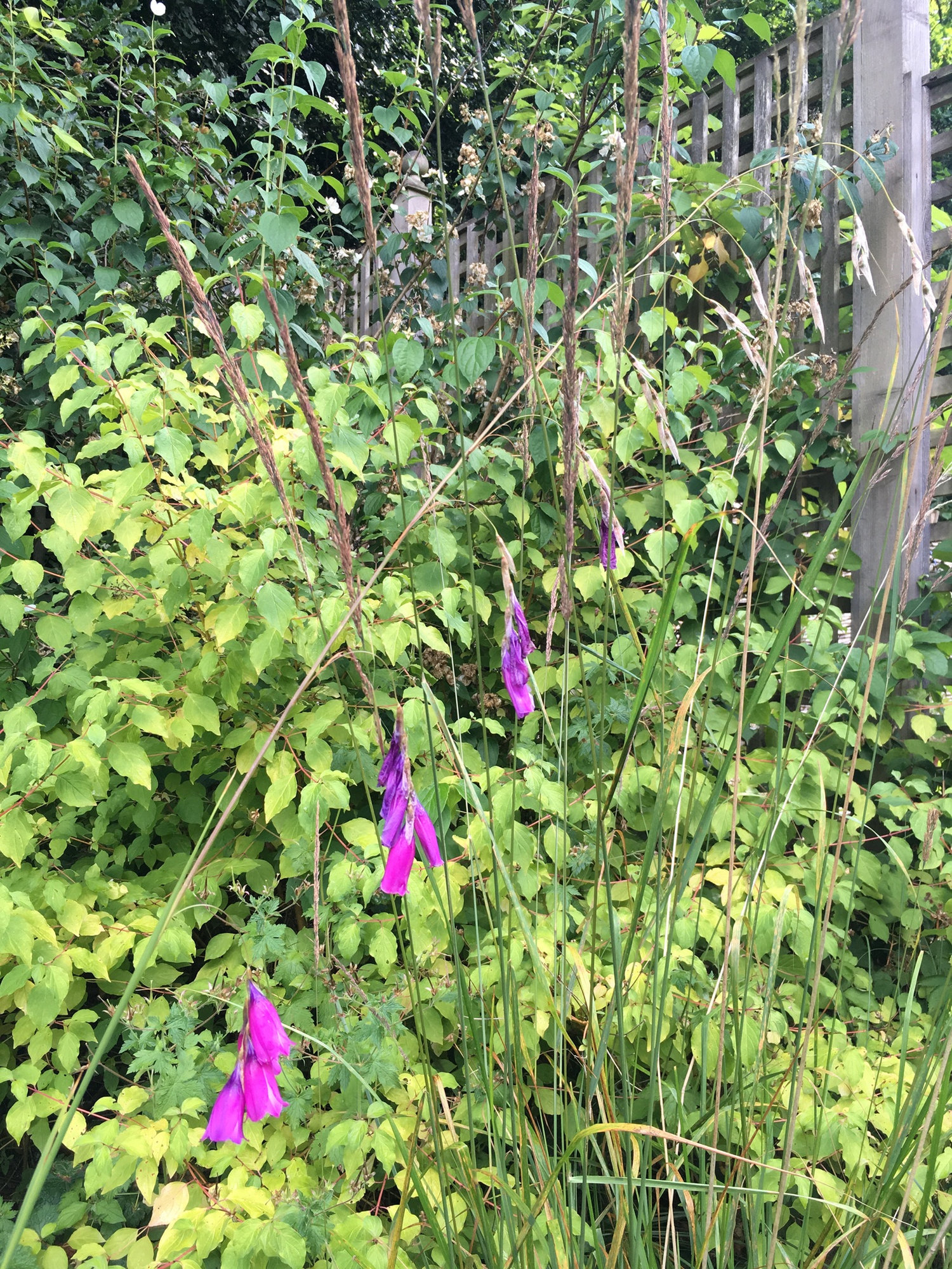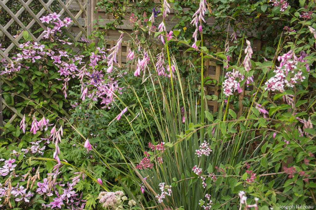 And my angel's fishing rod (Dierama pulcherrimum) 'Lancelot' is in full bloom too. Seen here in the company of Clematis SAPHYRA Double Rose on the left and Syringa microphylla 'Superba' on the fight. An "all-pink" scene, I'm afraid.