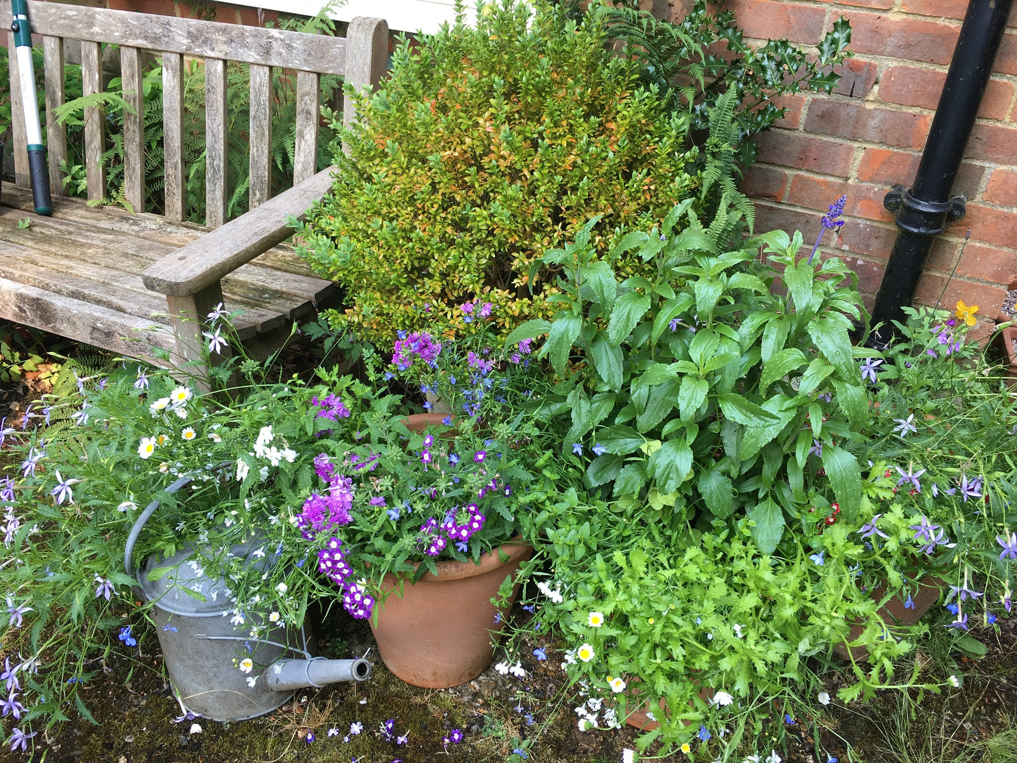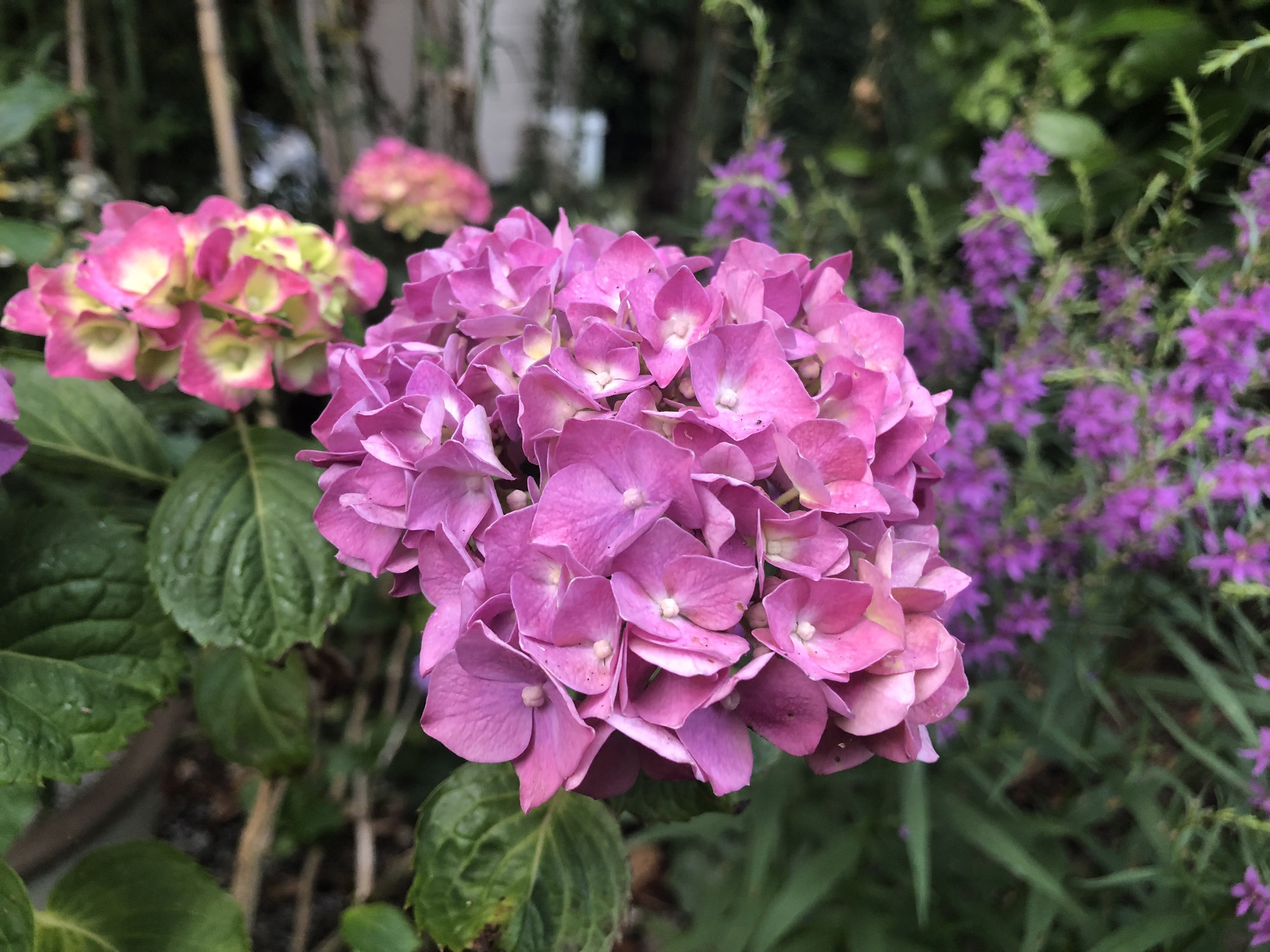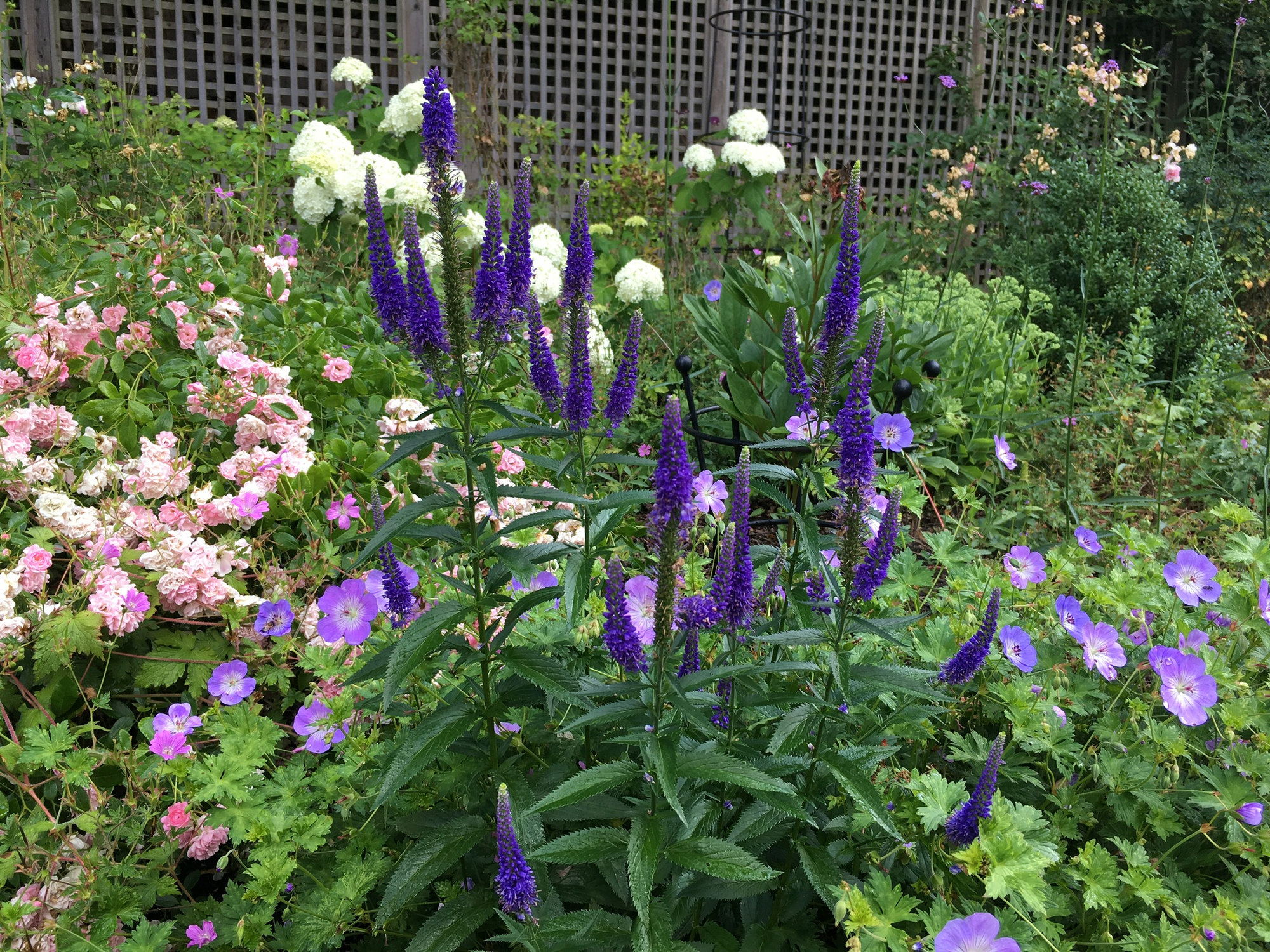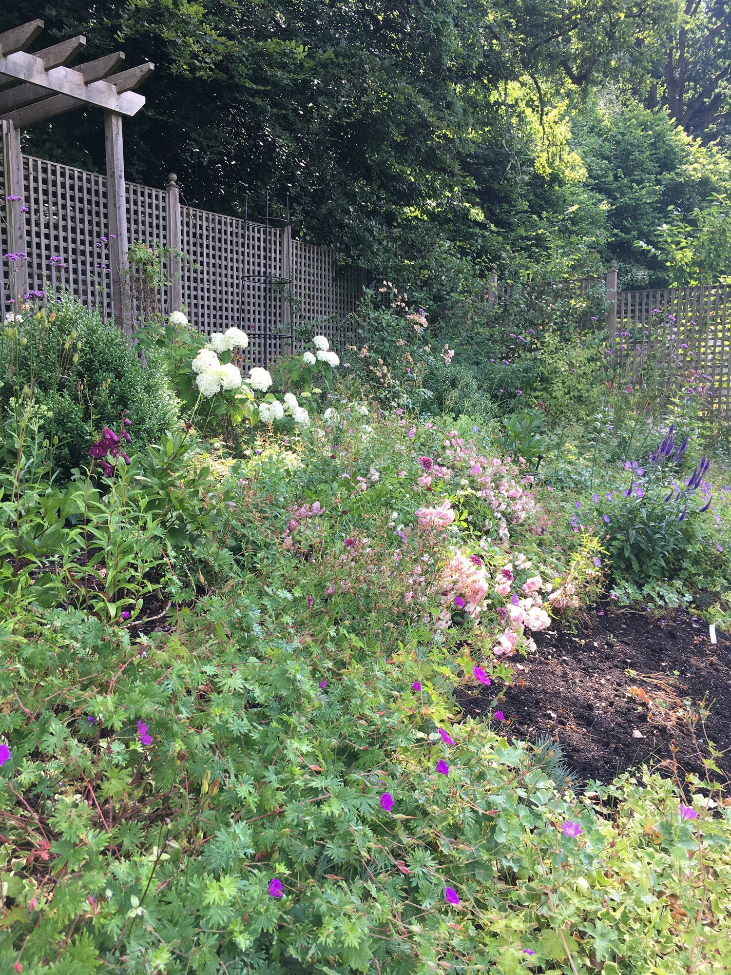 And my angel's fishing rod (Dierama pulcherrimum) 'Lancelot' is in full bloom too. Seen here in the company of Clematis SAPHYRA Double Rose on the left and Syringa microphylla 'Superba' on the fight. An "all-pink" scene, I'm afraid.