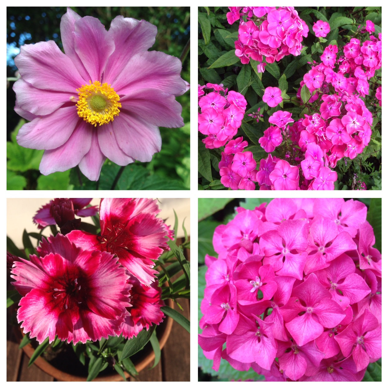 Anemone ‘Queen Charlotte’, perennial Phlox, Dianthus and Hydrangea.
