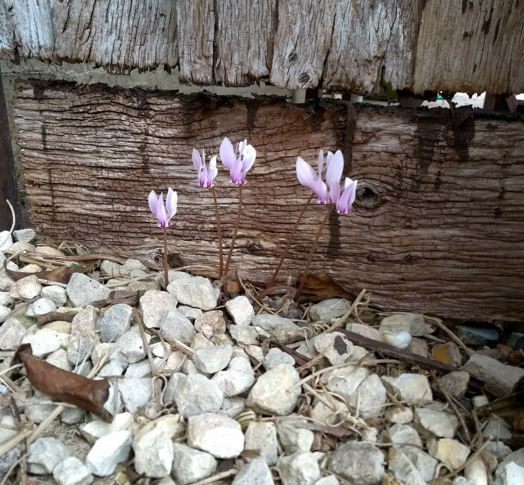 Since I bought my house two summers ago, I've occasionally noticed these flowers appearing in the corner of my patio. They've reappeared over the last few days which reminded me to track down an identification. Seems like it's a hardy cyclamen flowering earlier than usual.