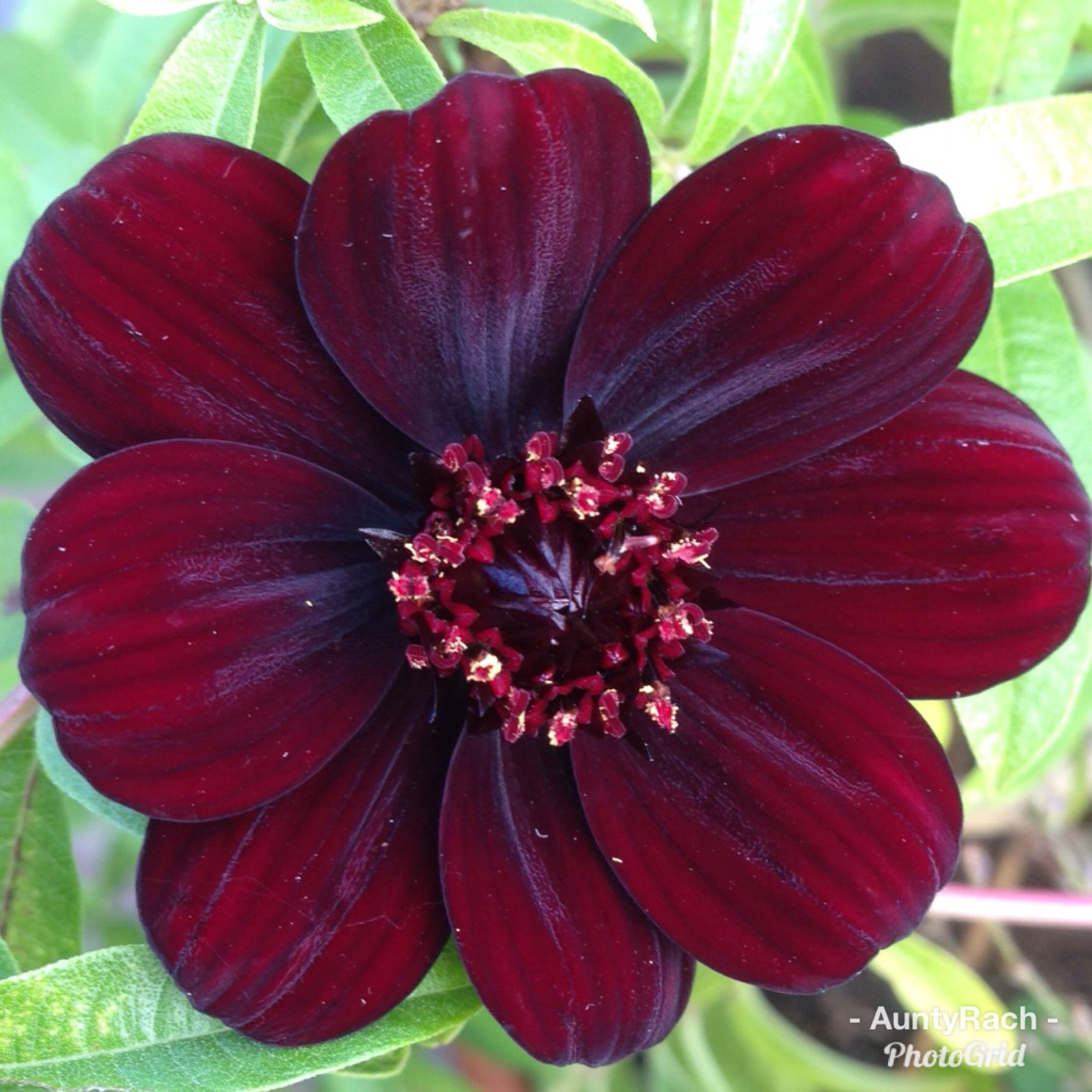Cosmos atrosanguineus Chocamocha. The pollen looks like gold dust. (The eagle-eyed will notice the foliage is not from the Cosmos, but a Lemon Verbena).