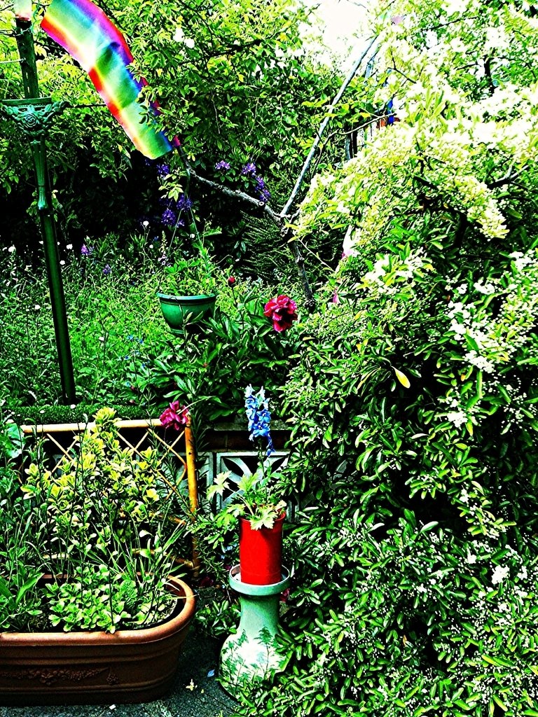 As you can see, I am a naturalist gardener! Here's a photo from last year of a delphinium, a firethorn bush (to the right - just sprung up there!), a wild rose trained, over the rainbow!, from next door (shh!) and in the background is my lawn meadow.