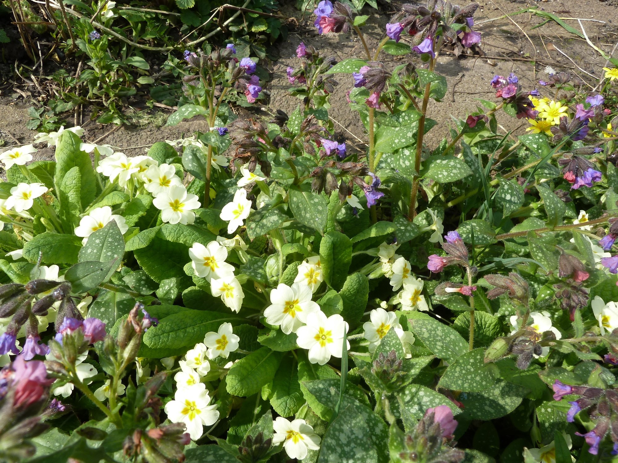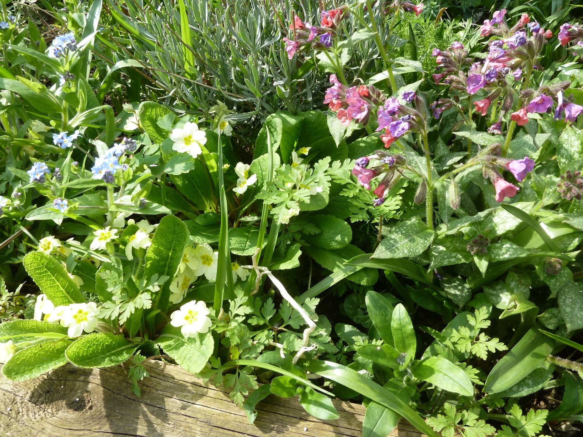 New front raised bed. Cowslip, creeping veronica, fmns, primroses.