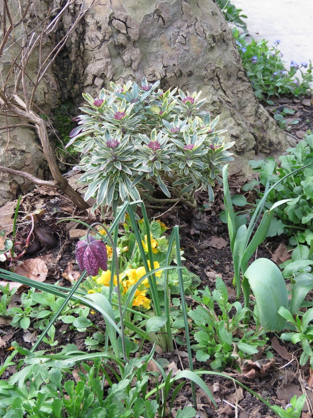 Planting under the street tree in front of my house. Not very 'guerilla' as the council are very encouraging. Snakes' heads peaking, wallflowers about to pop, nibbled primroses, shed-loads of ox eyes self-seeded everywhere.