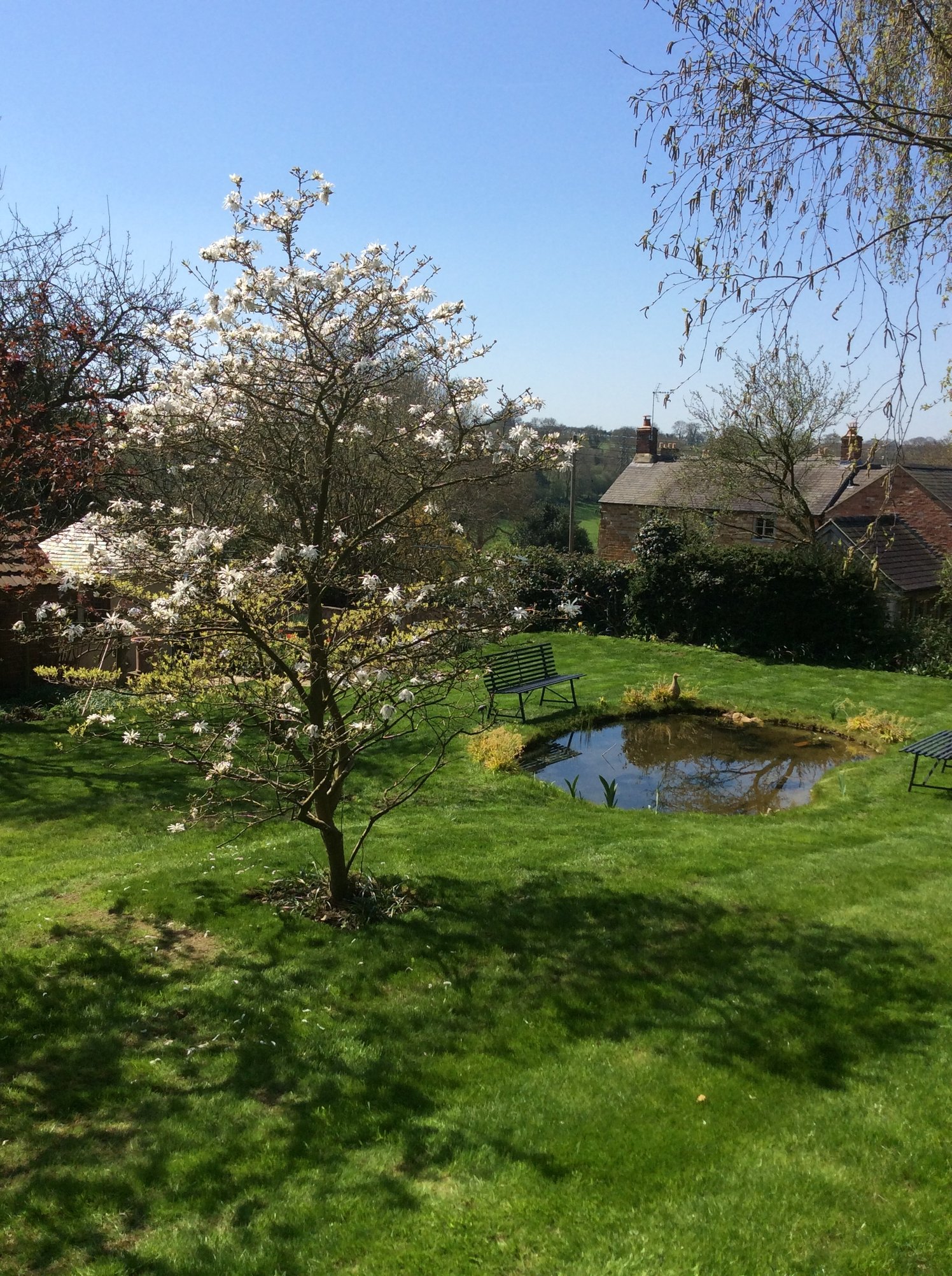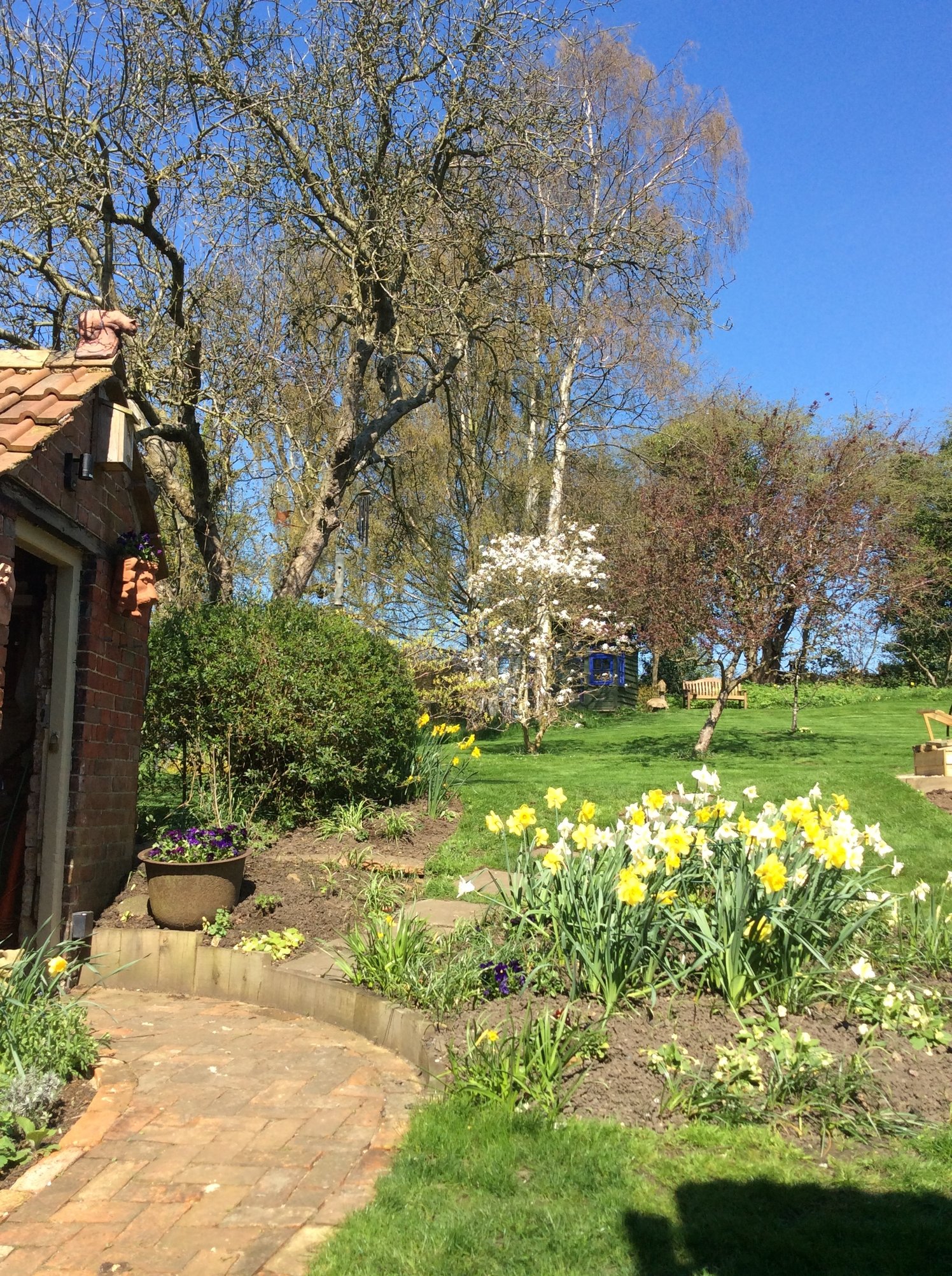 A pity the crab apple isn’t quite in bloom. The daffodil bed will soon be mass planted with geranium Rozanne with a single central geranium Anne Folkard growing over a peony support. In the small bed by the shed is geranium Patricia. The garden was transformed last winter/spring. All the planting apart from the trees has been done over the past year.
