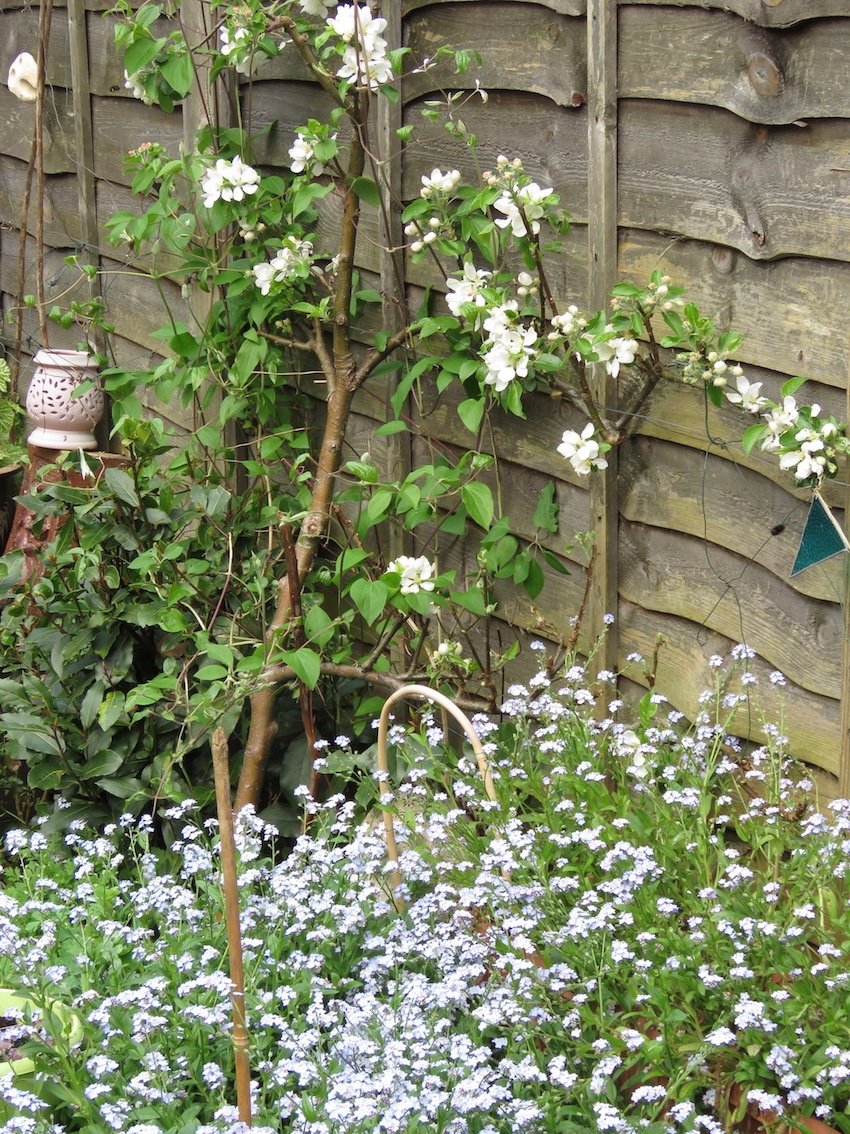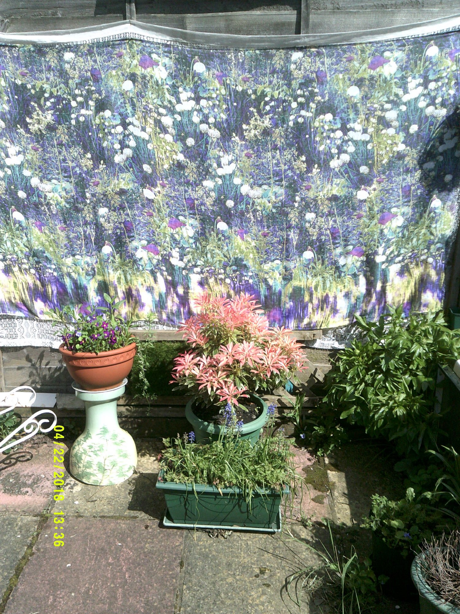 I have been looking for a suitable backdrop to cover the dingy fence (can't find a paint colour I like!) Recently I got this wonderful meadow-themed light fabric...for just £3 at a charity shop. Also co-stars a salvaged broken vase and a recently purchased skimmia.