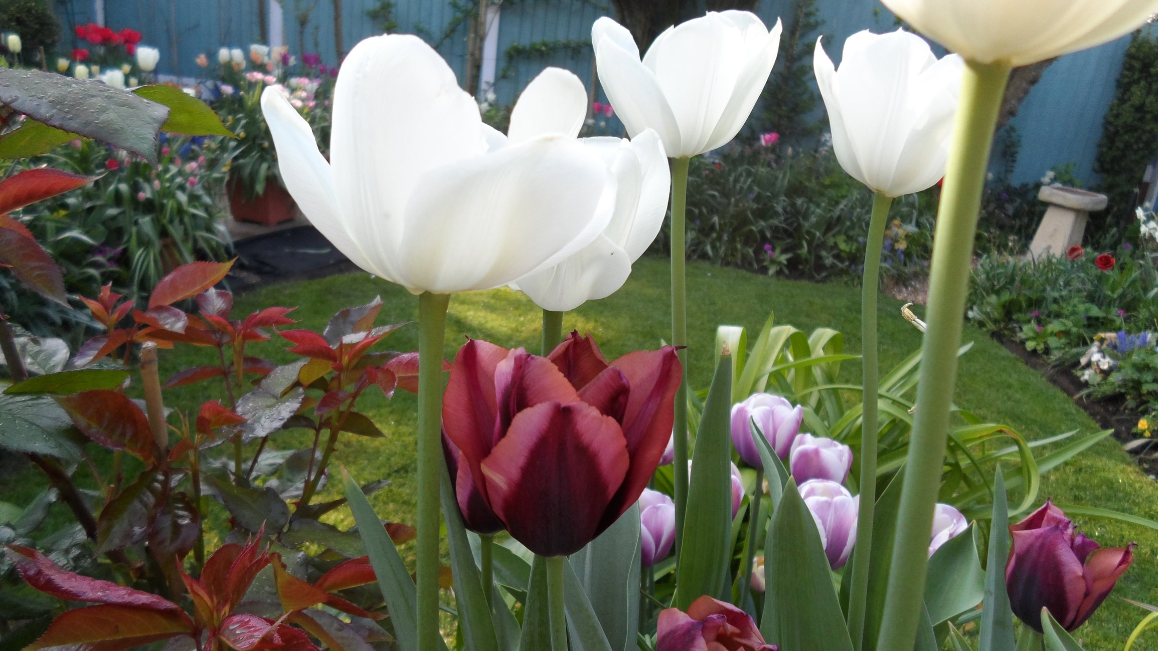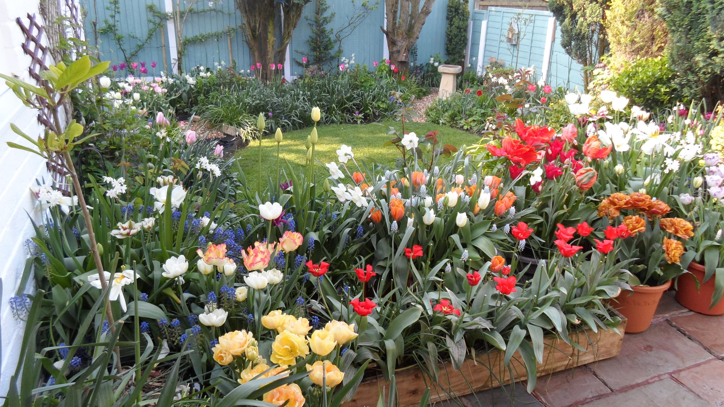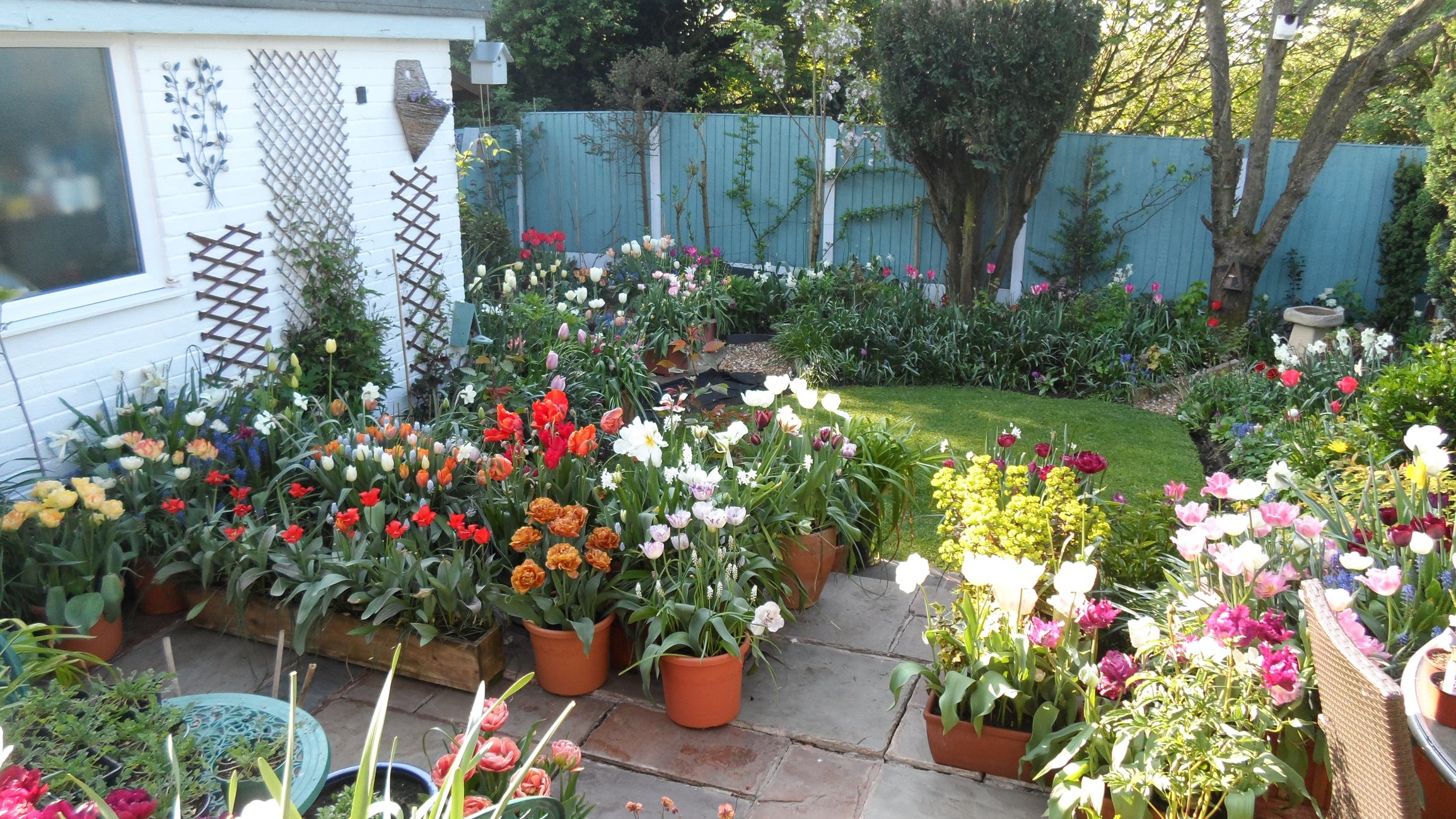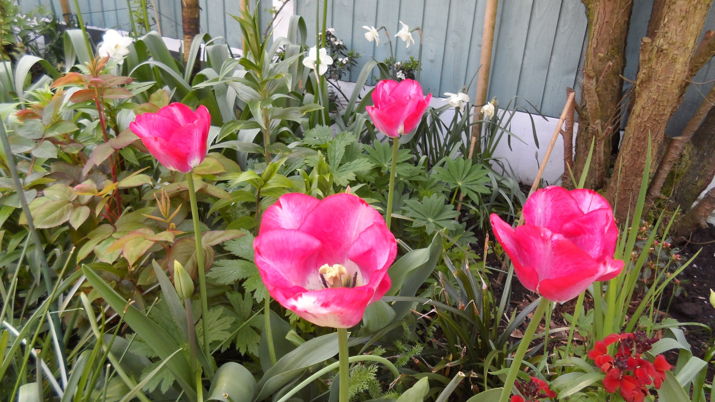 Tulips out in force now hot weather has opened them all up as the daffs make way.