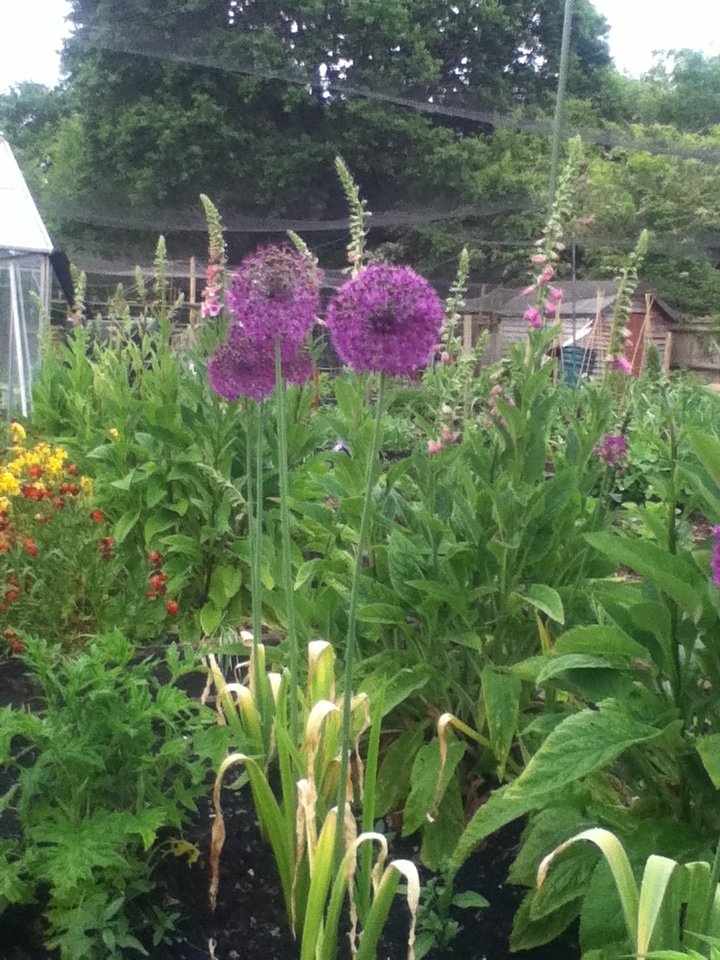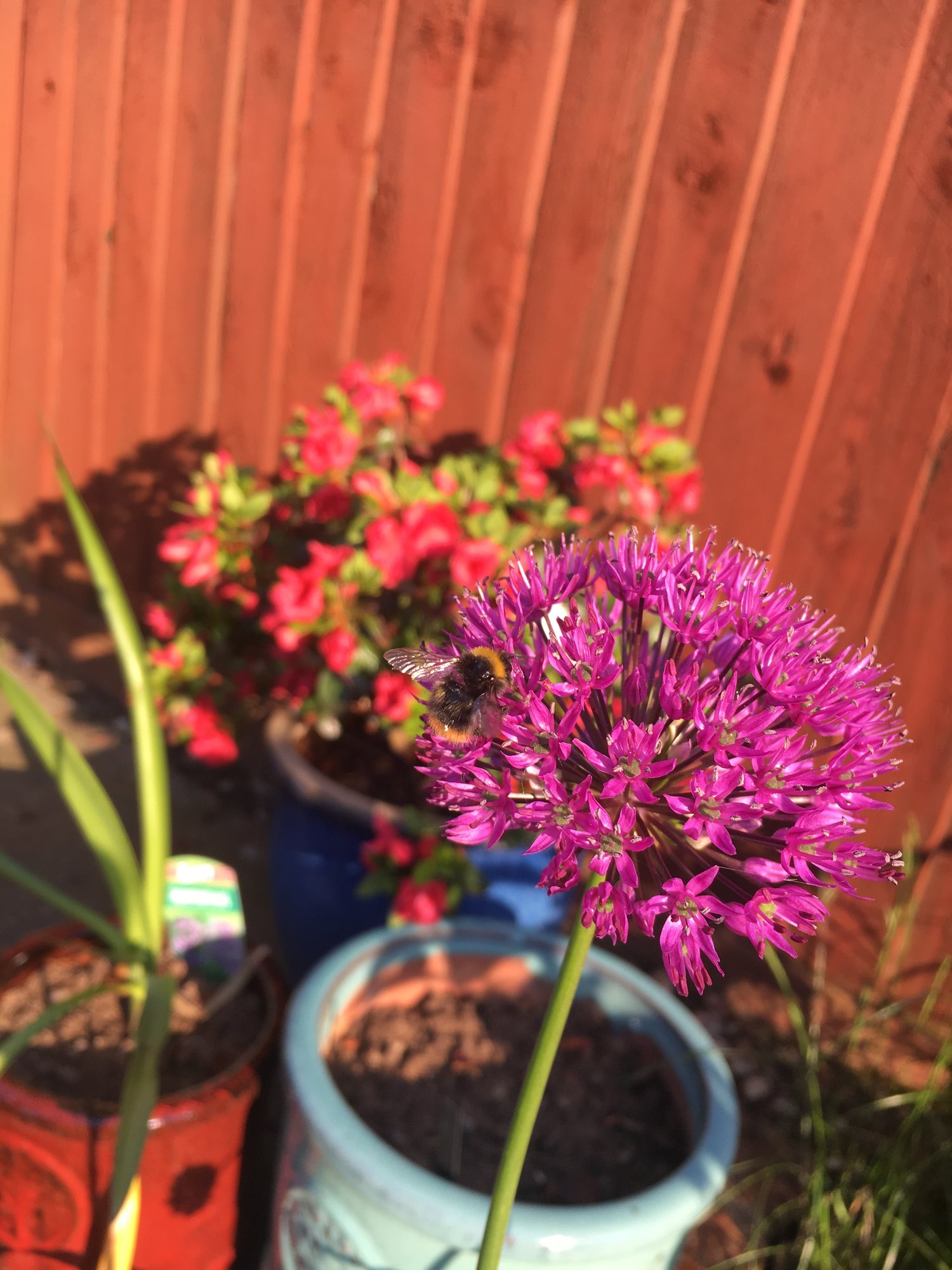My first bee visitor to the alliums that I’ve seen. I love the purple of these