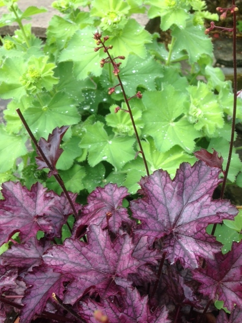 Heuchera ‘Blackberry Jam’ (I think!), with Alchemilla Mollis.