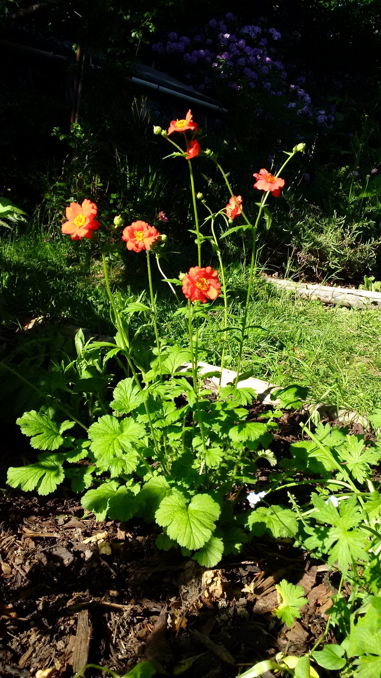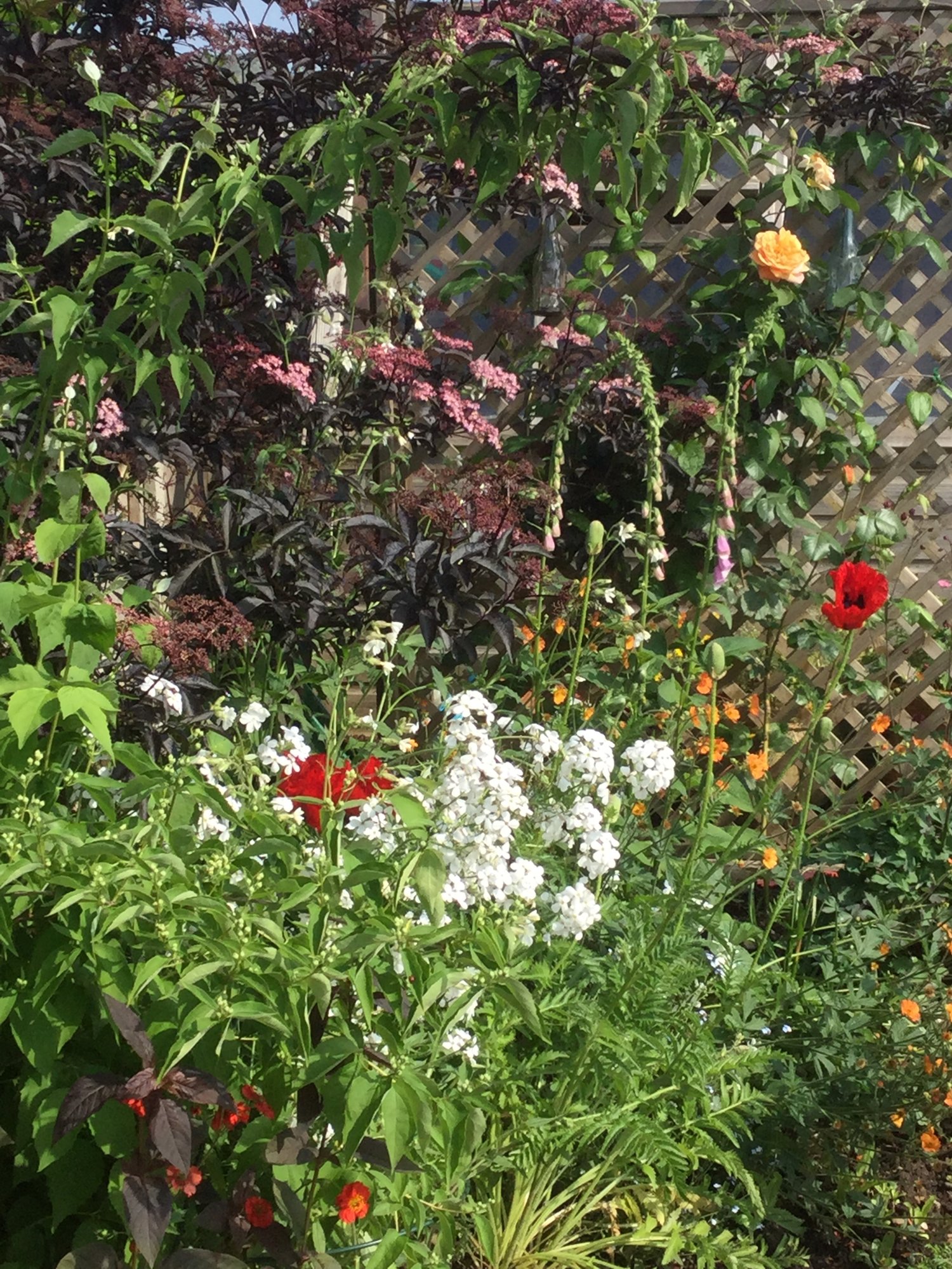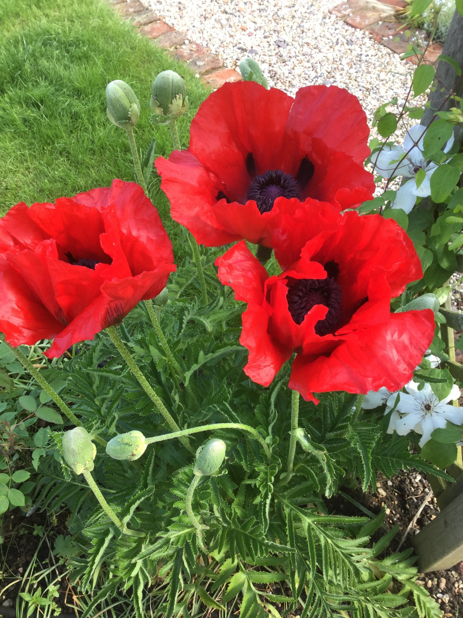 A few snaps from the garden today. First poppies to bloom, with clematis Edith (in memory of my Mum) St Swithins rose first bloom (I was born on St Swithins day). Clematis Niobe Geum Totally Tangerine “schoolgirl” rose? Can’t remember which geranium this is.