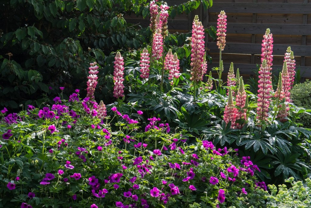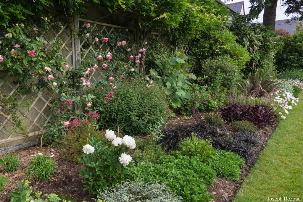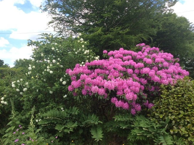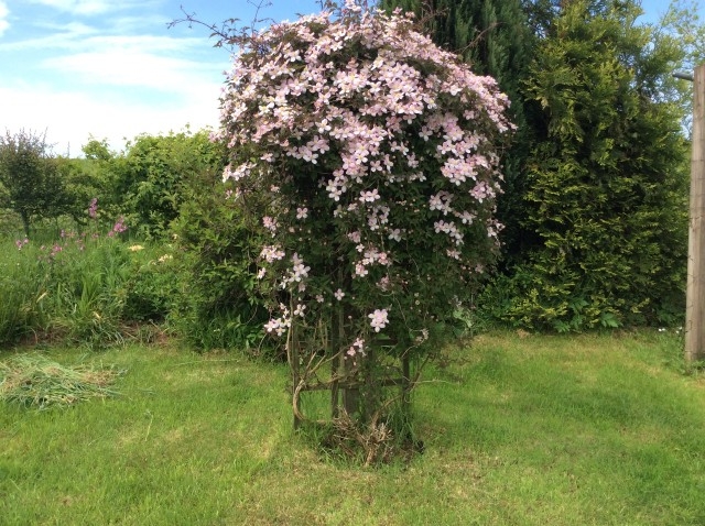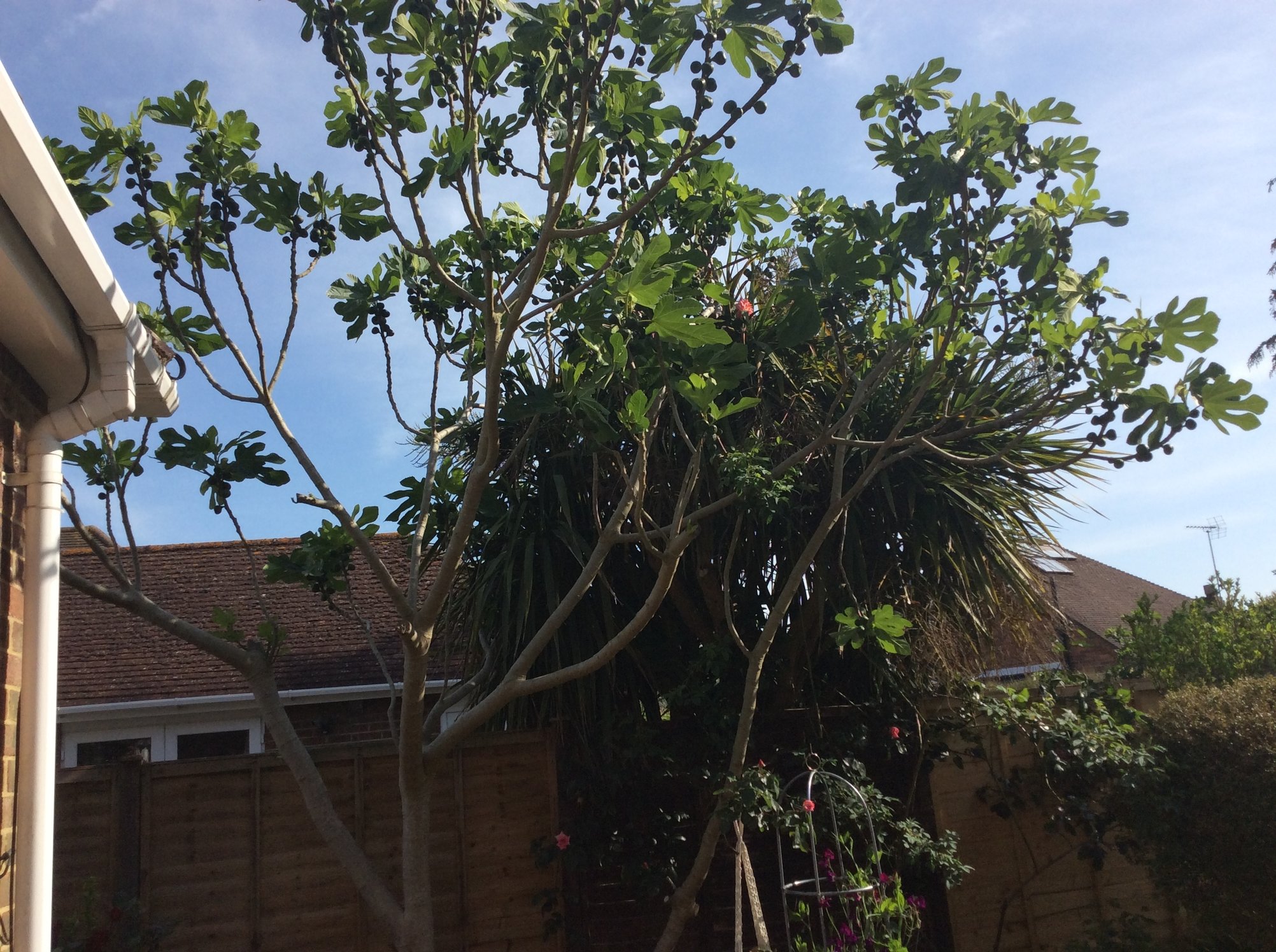 The fig has plenty of fruit begining to form. But is a good thing I don’t like figs as the birds will get them all. If you look closely you will see at the top of the fig a rose that has opened. This comes from a climbing rose on the fence but this year it has already climbed an additional 6 ft into the fig. The palm behind is in my neibours garden but the rose will by the end of summer weave itself through that as well.