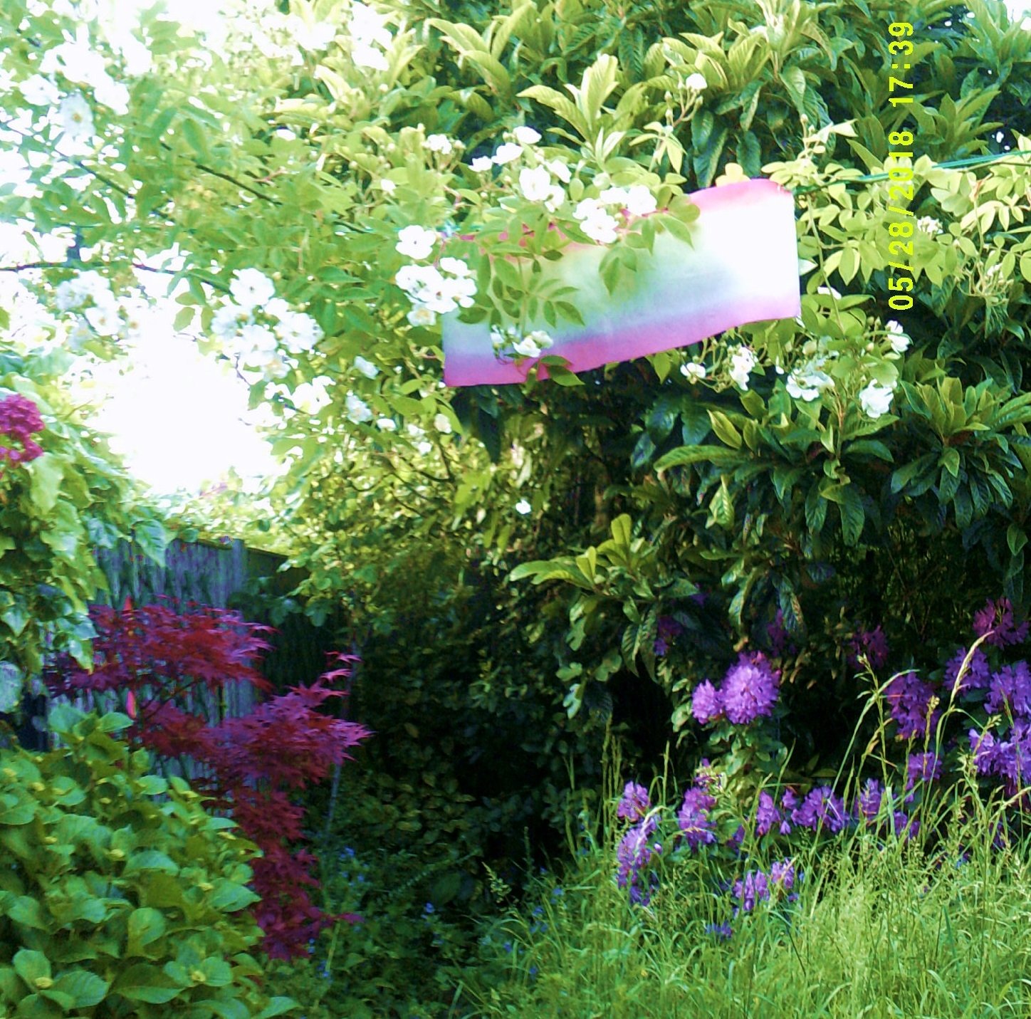 rainbow there. On the left, there's a hydrangea bush (in bud) and a