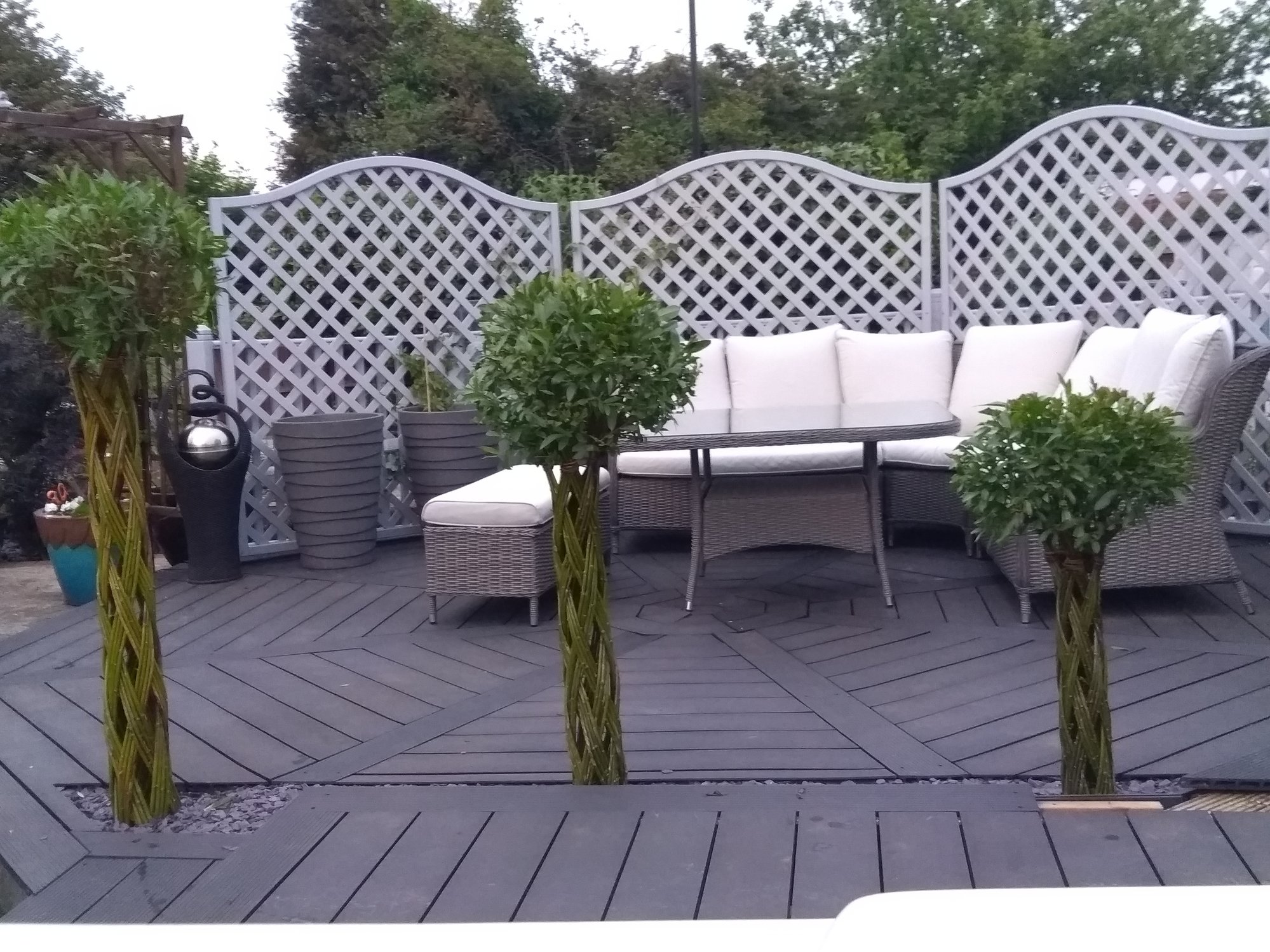 New trellis with struggling clematis , (jingle bells and Dorothy Walton). Crying out for planting suggestions in front, wanting a grass maybe.
