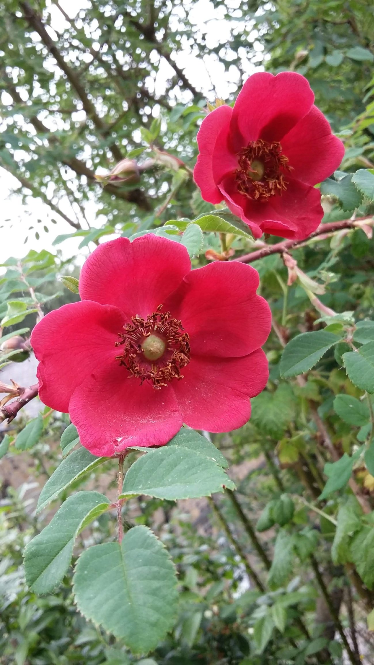 Rosa moyesii 'Geranium' is the first rose flowering here: