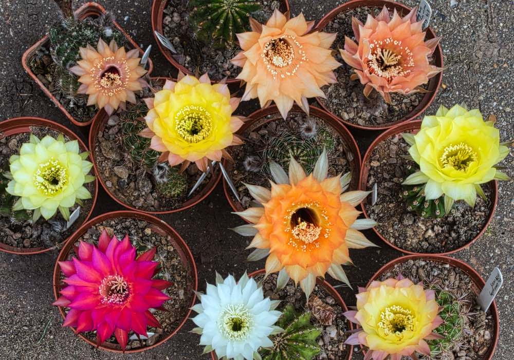 Several of my Echinopsis cacti have decided to flower in synchrony. These are all grown from seed which I produced myself and sowed in 2013. Some flowered one or two years ago, others are flowering for the first time.