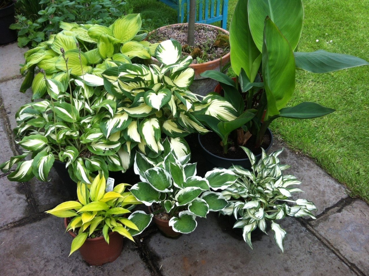 Some of the hostas in their summer spot on the terrace ... they're really looking good this year ... so far