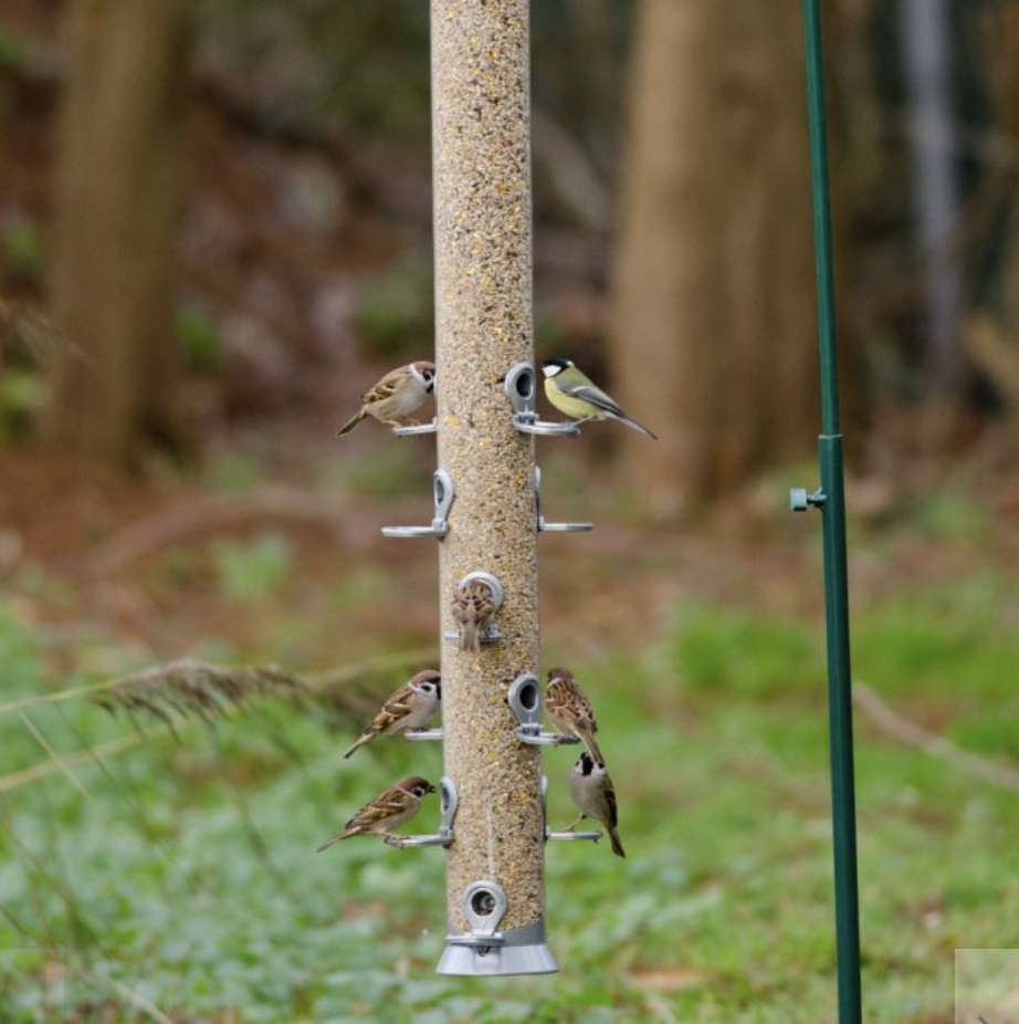https://www.birdfood.co.uk/guardian-with-2-port-seed-feeder (fixed to the ground with a pole for sturdiness)