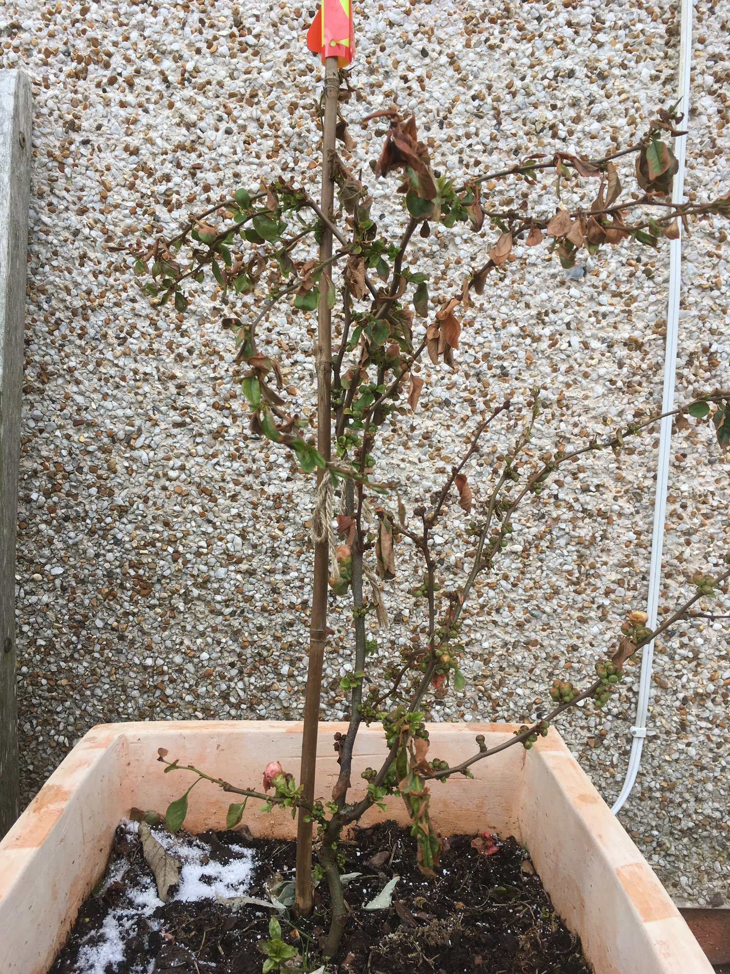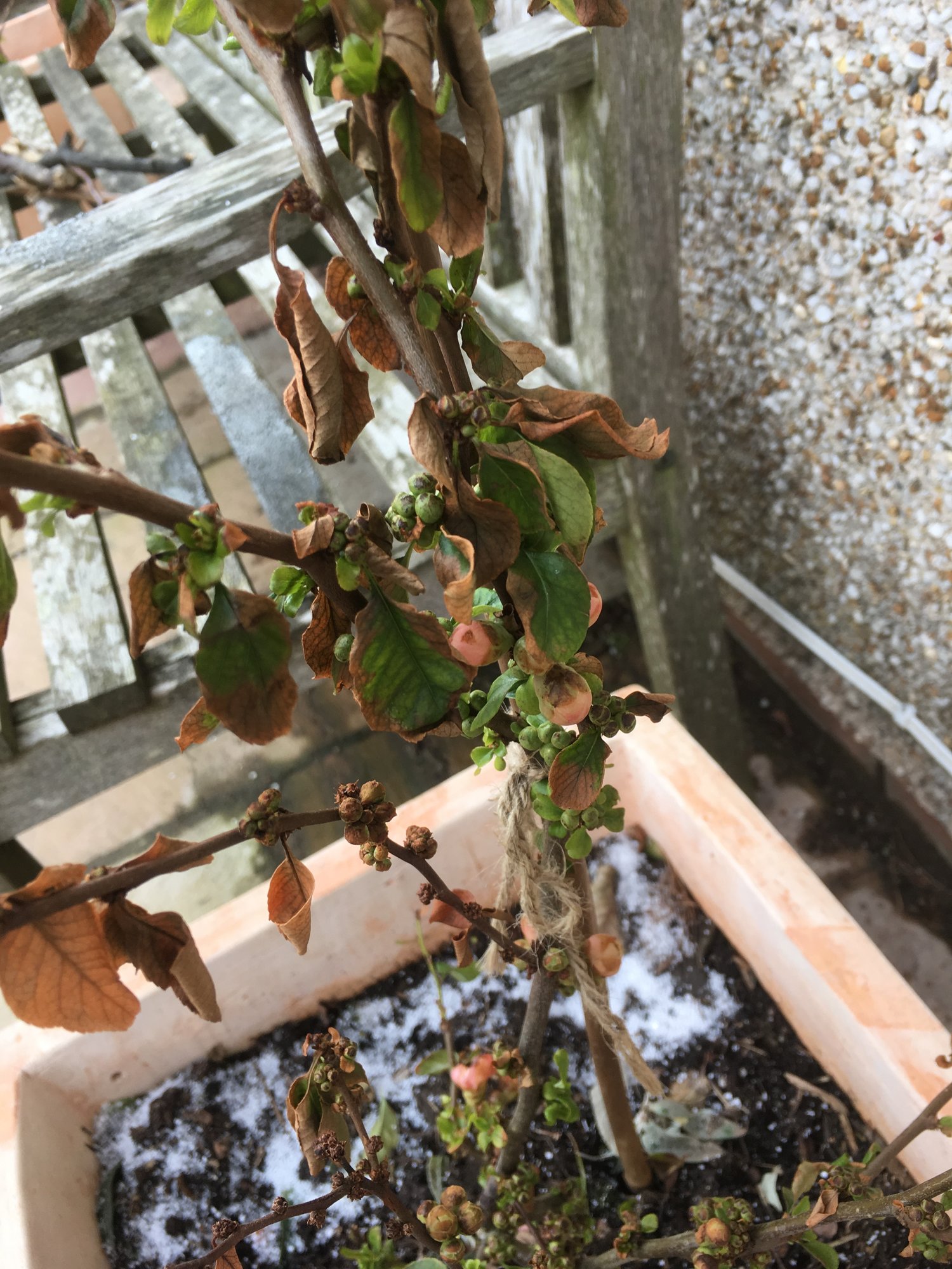 hi there, hope you can advise. I have two chaenomeles ‘geisha girl’ in large pots I was hoping to plant in a good spot in the garden soon. However, after ‘the beast from the east’ had done its thing they look pretty awful: