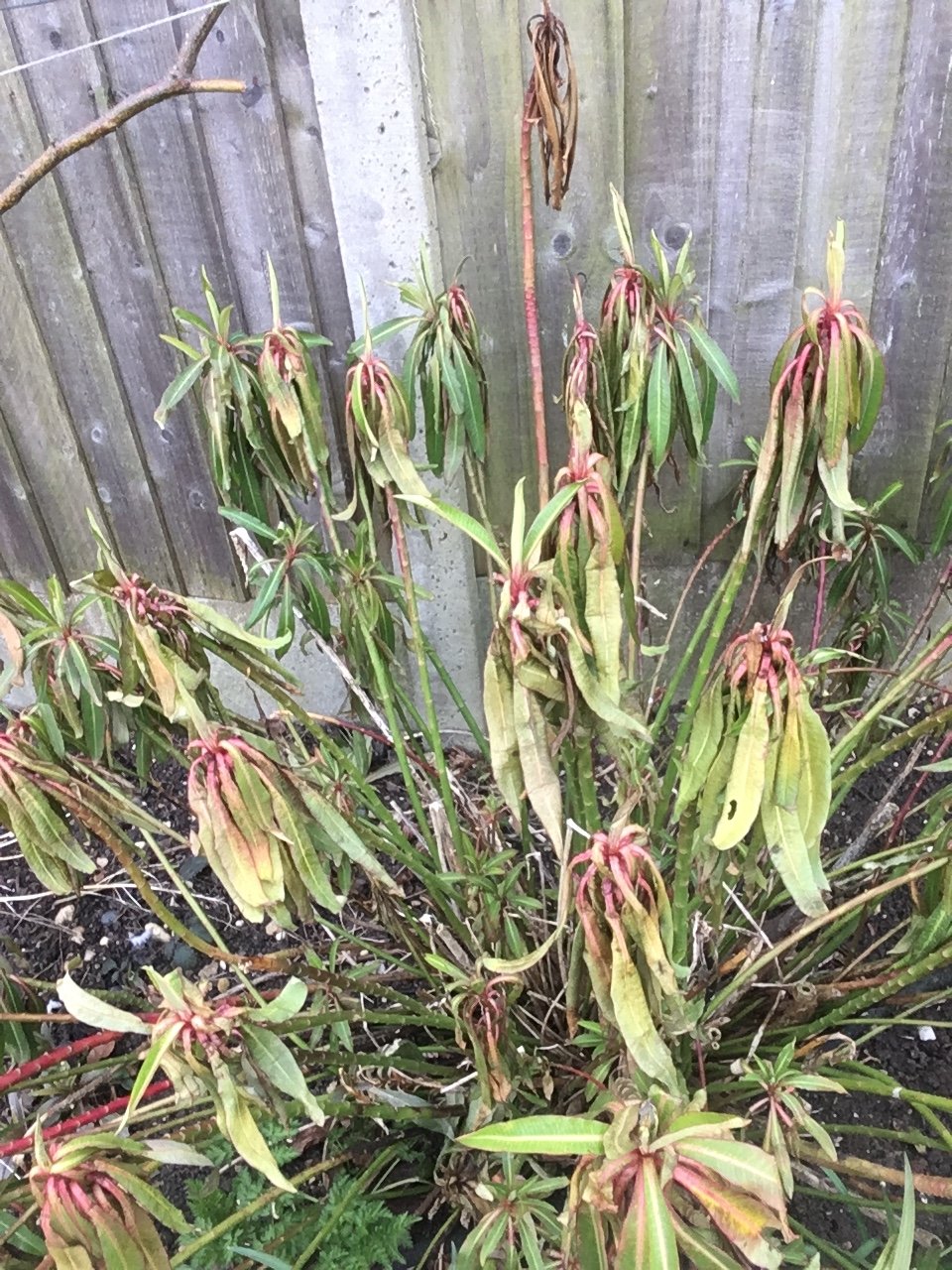 we moved into our house last April and the plant pictured was not doing very well. I cut it right back and it grew back again and stayed evergreen over winter but has produced no flowers and is now starting to die back again (photo is the present state)