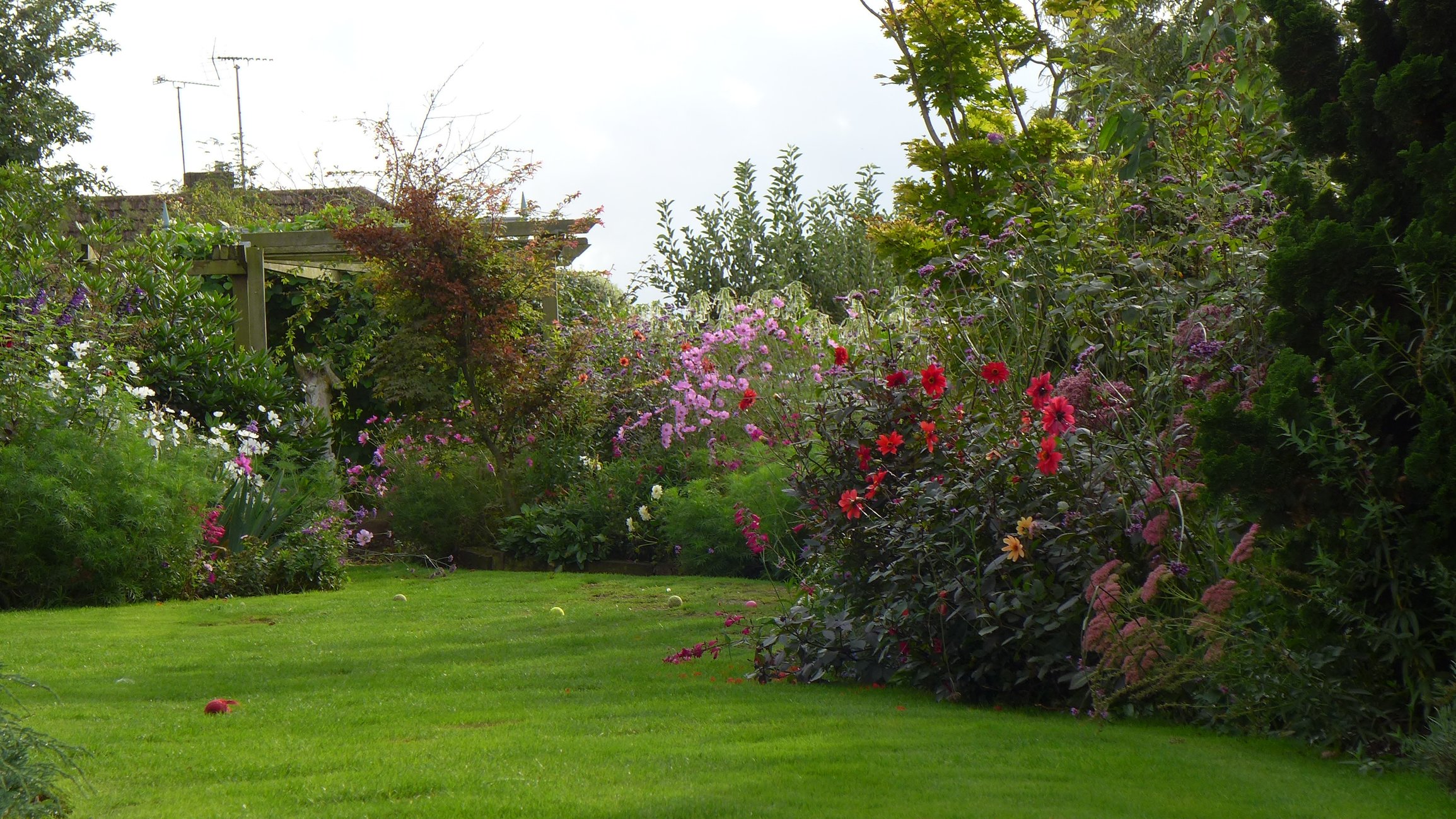 Further down I've tried to make it appear that the 'path' branches off either side as the grass goes behind the border with dahlias, then the middle bit of lawn tapers leading to the the pergola