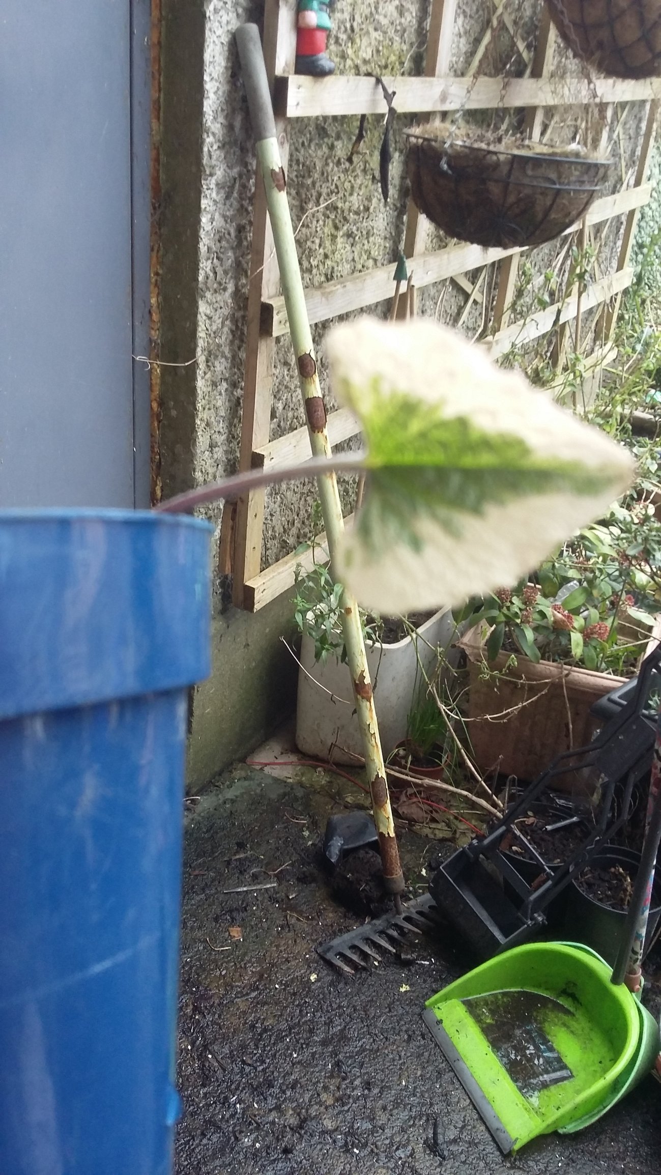 health and safety alert. Can you please turn your rake up the other way and put the prongs against the fence/ wall. I have vivid memories of my dear late Mother standing on a rake which had been left as yours is , and it smacking her hard, right in the face.