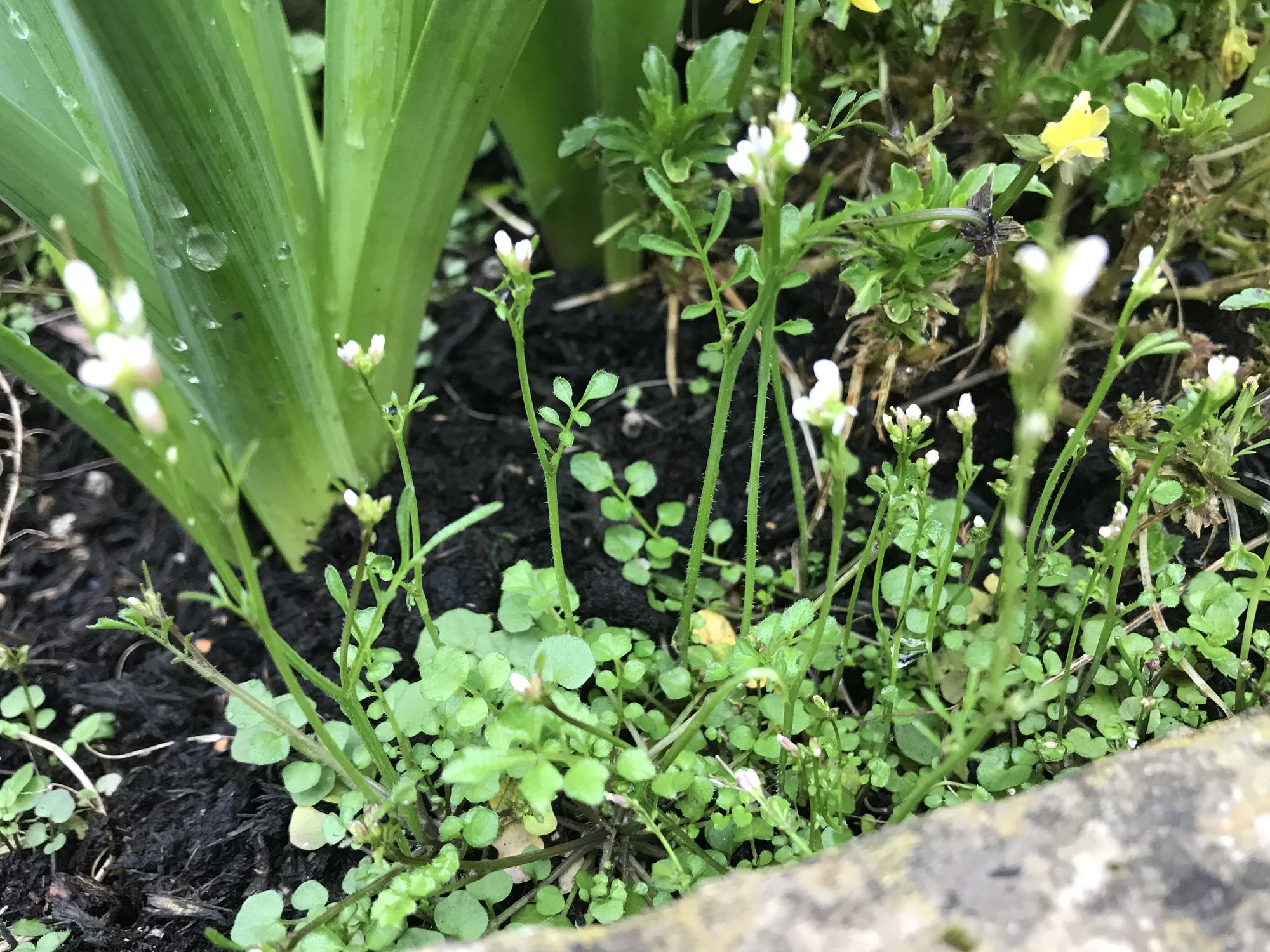2) Hairy bittercress (with the little white flowers) and the remains of some yellow pansies
