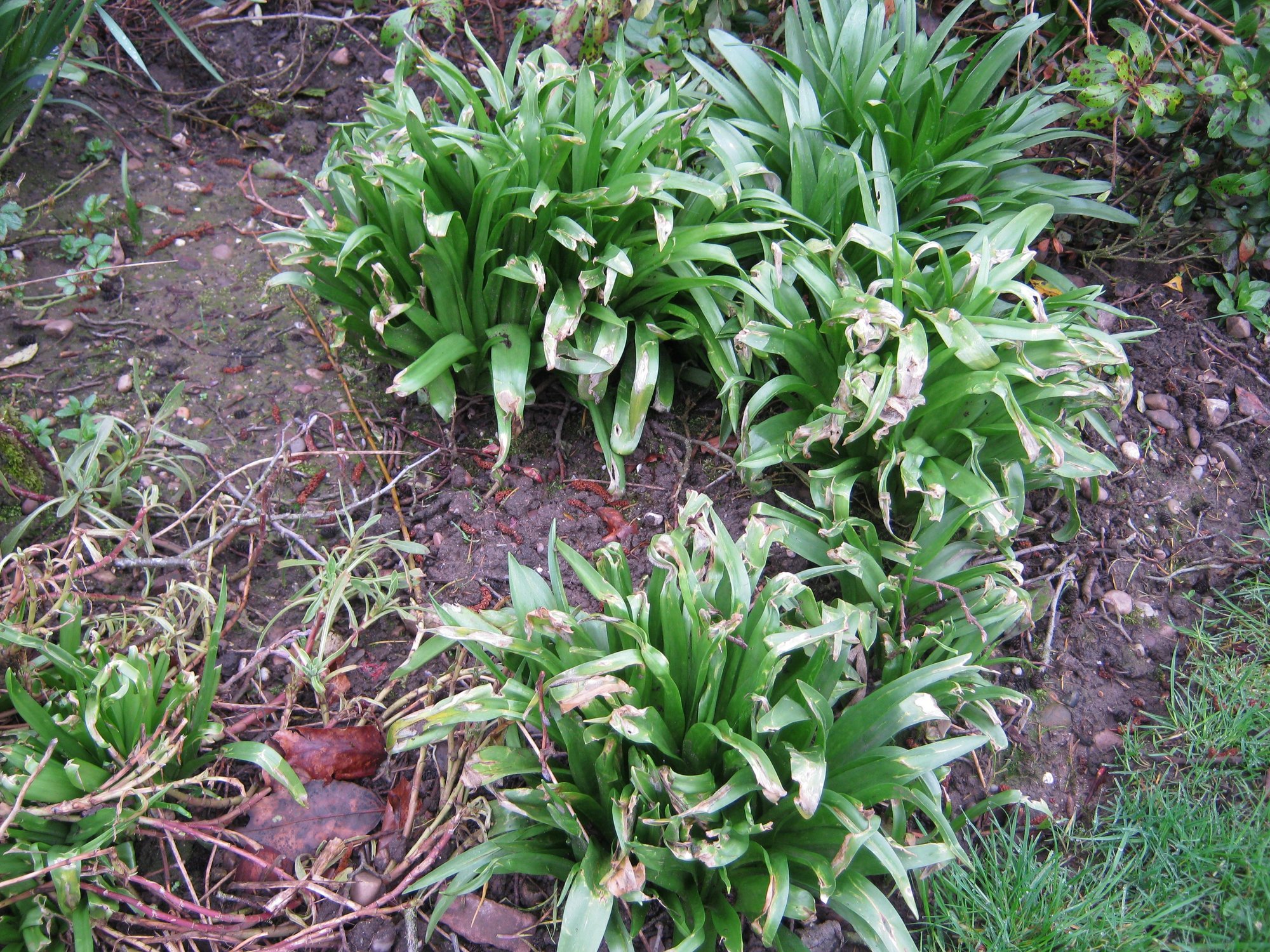 I'd be grateful if someone could help me ID the below plants . When they first started to come up I assumed they were spring flowering bulbs there's but no sign of any flowers. Not sure if any of the 3 frost (?) damaged plants or the healthy one just behind them in the first pic are the same as the one in the second pic.