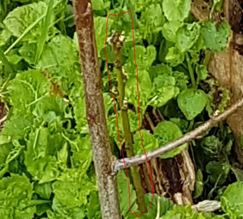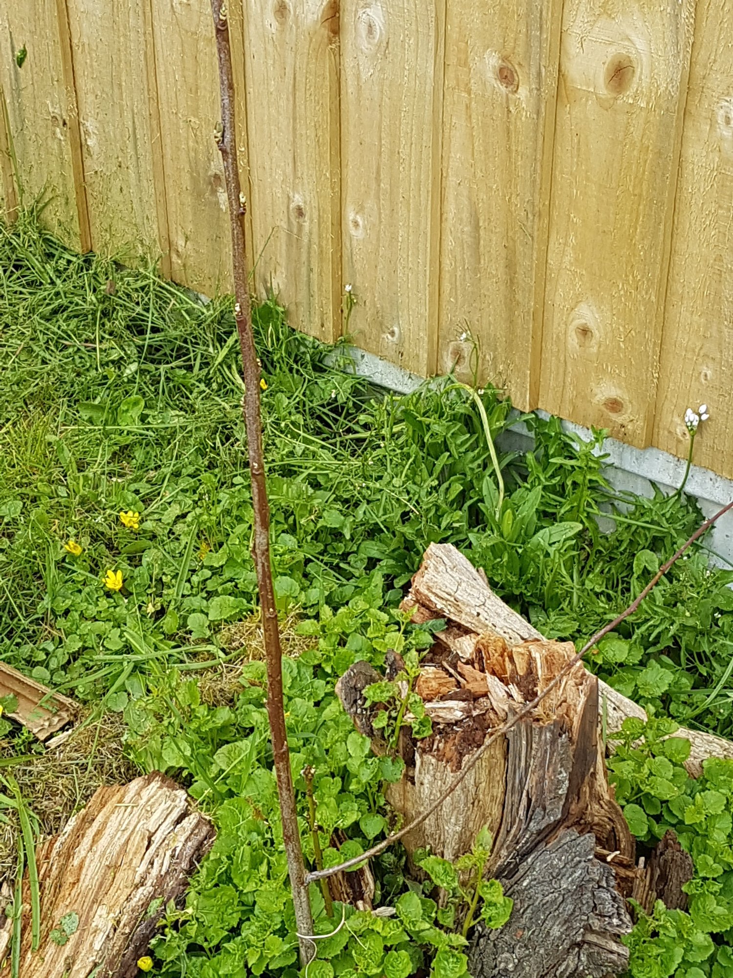 as that could be a sucker from the rootstock and will not produce a tree with nice fruit. A sucker will take energy from the roots which should be going into your tree and will eventually take over and your bought tree will die. It might just be another plant but it's too close to the tree so still needs removing. Try and keep a 60-90cm diameter circle of clear ground beneath the tree so it doesn't have to compete with other plants.