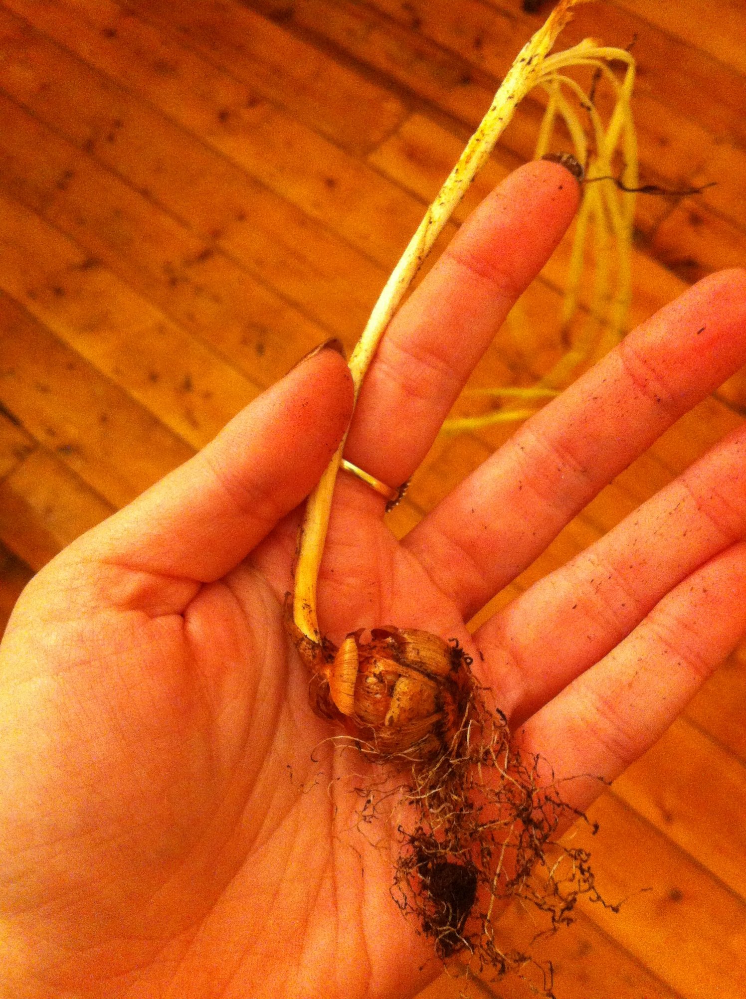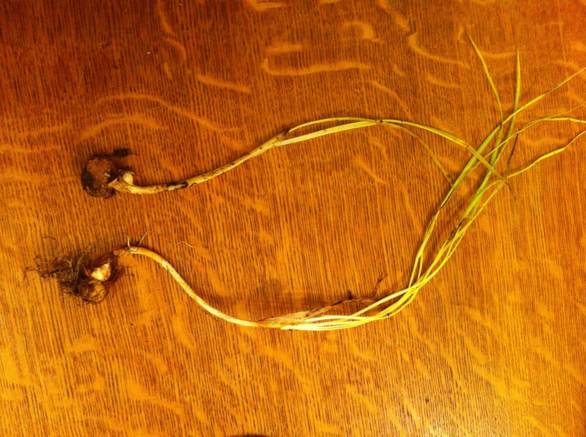 My grandad has very sweetly sent me a whole tub of bulbs in the green because he heard I was thinking of planting crocuses under my lawn. He said he thought they were crocuses but was not sure. Personally I thought the leaves looked a bit 'stringy' to be crocuses but that may be because they are not in fantastic health.