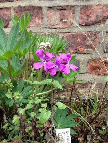 The flower and heart-shaped leaves look like honesty (Lunaria) to me, though not sure - a bit redder in the stems and sparser than I would expect. And yes, lupin in the background.