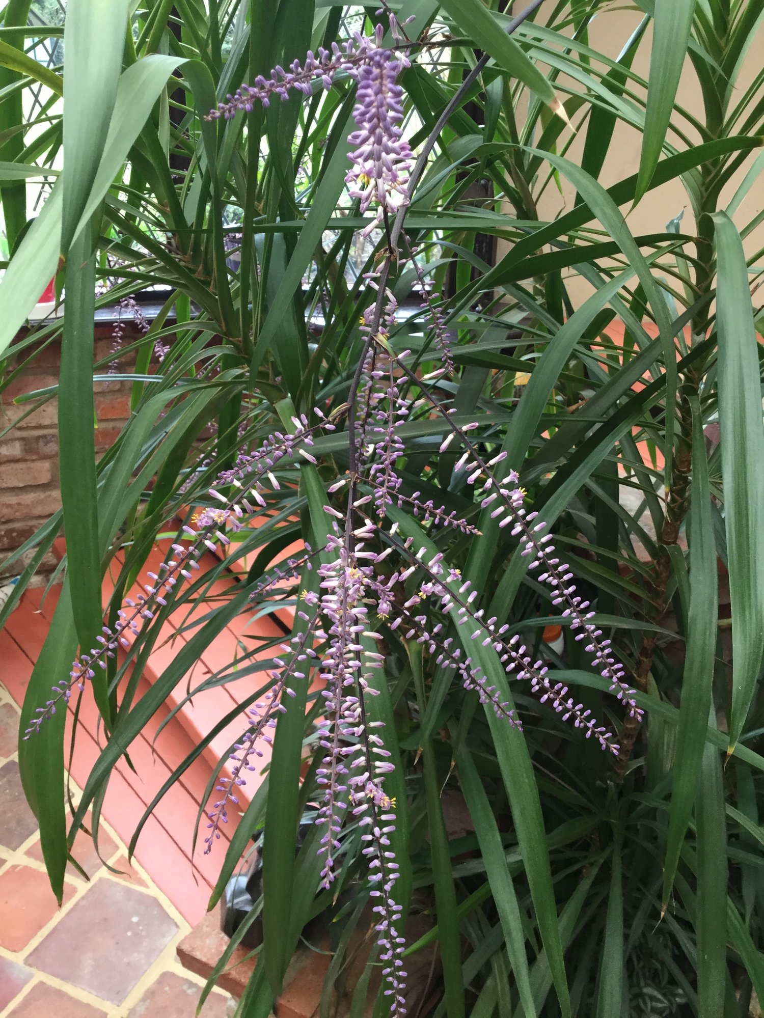 Hello everyone, we are lucky to have just moved into our new home which has a garden room 😊 One of the palm type plant has produced some long fronds with purple flowers and yellow ‘middles’. I have googled relentlessly but can’t identify the plant, any ideas? Thank you