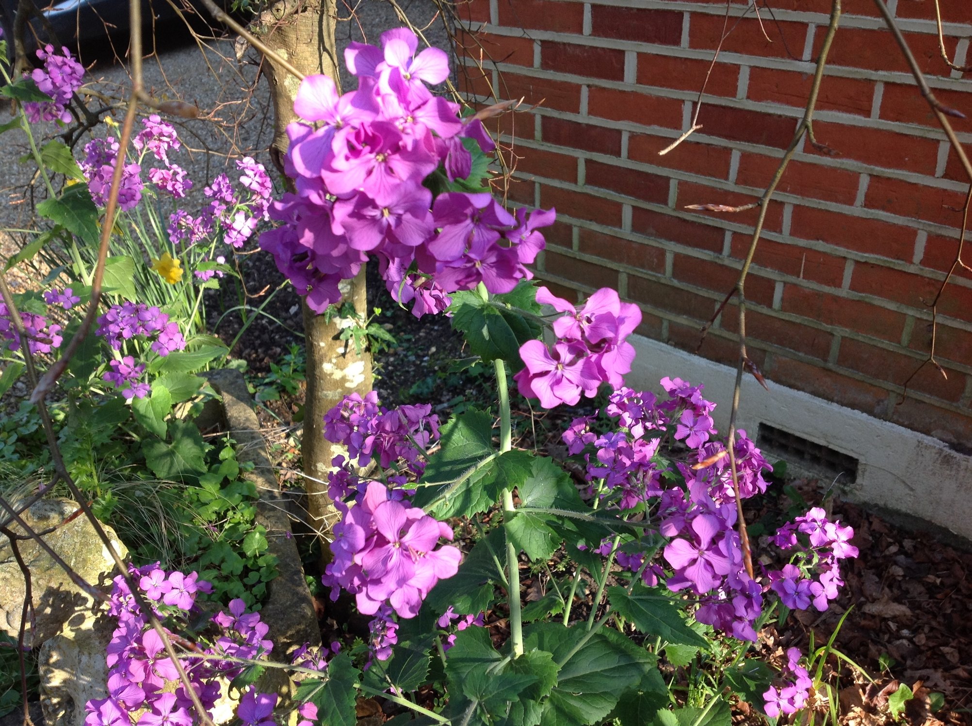 Hesperis matronalis flowers a bit later and has a different shaped and slightly hairy leaf.