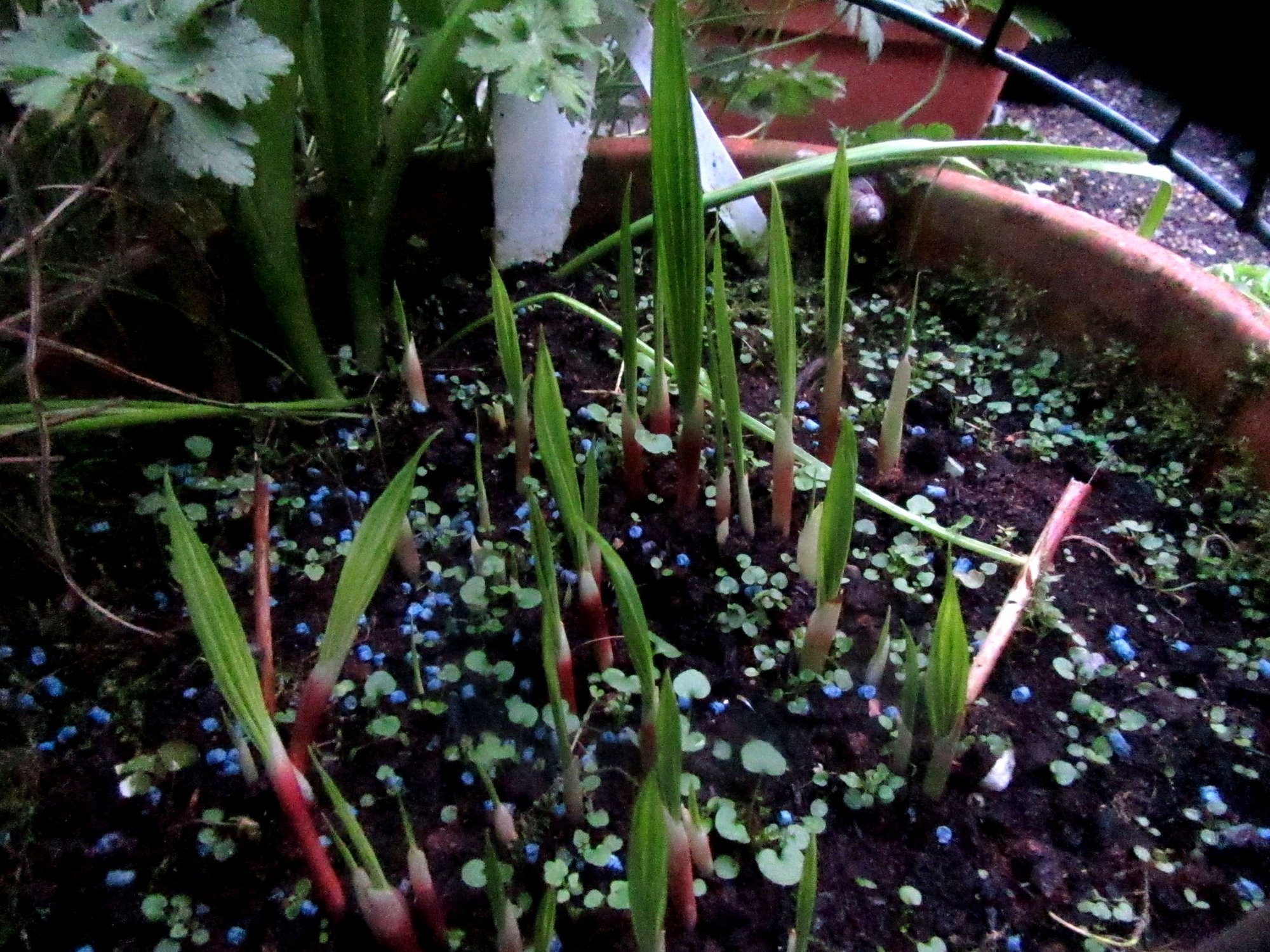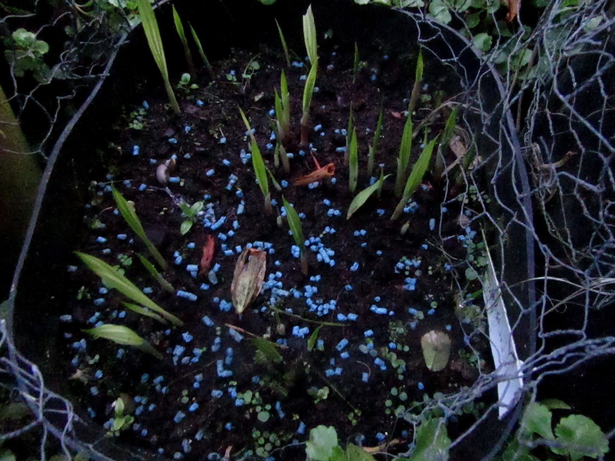 Lots of Slug Pellets and Chicken Wire to protect the Tigridia pavonia 'Mexican shell flower/Tiger Flower',..from slugs and snails as they love these young shoots,..however no sign of any snails or slugs,..i think i killed them all prior to spring,..touch wood.