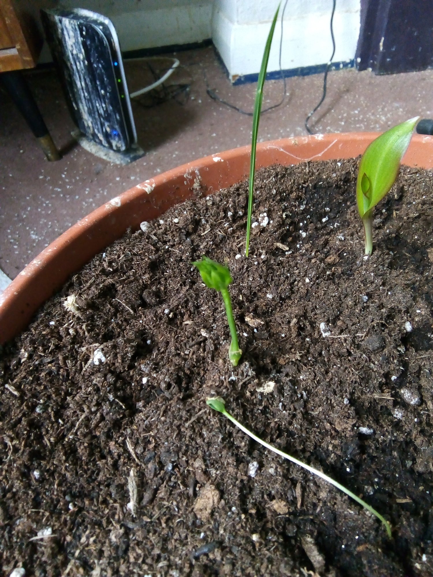 this plant which I found growing in the middle of a pot under loads of compost. It seems to be growing a flower. The centre plant.