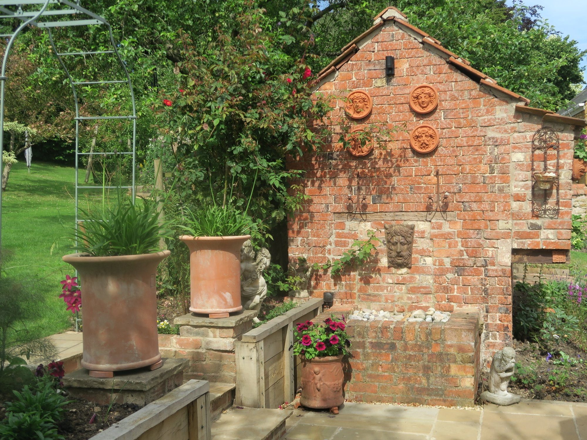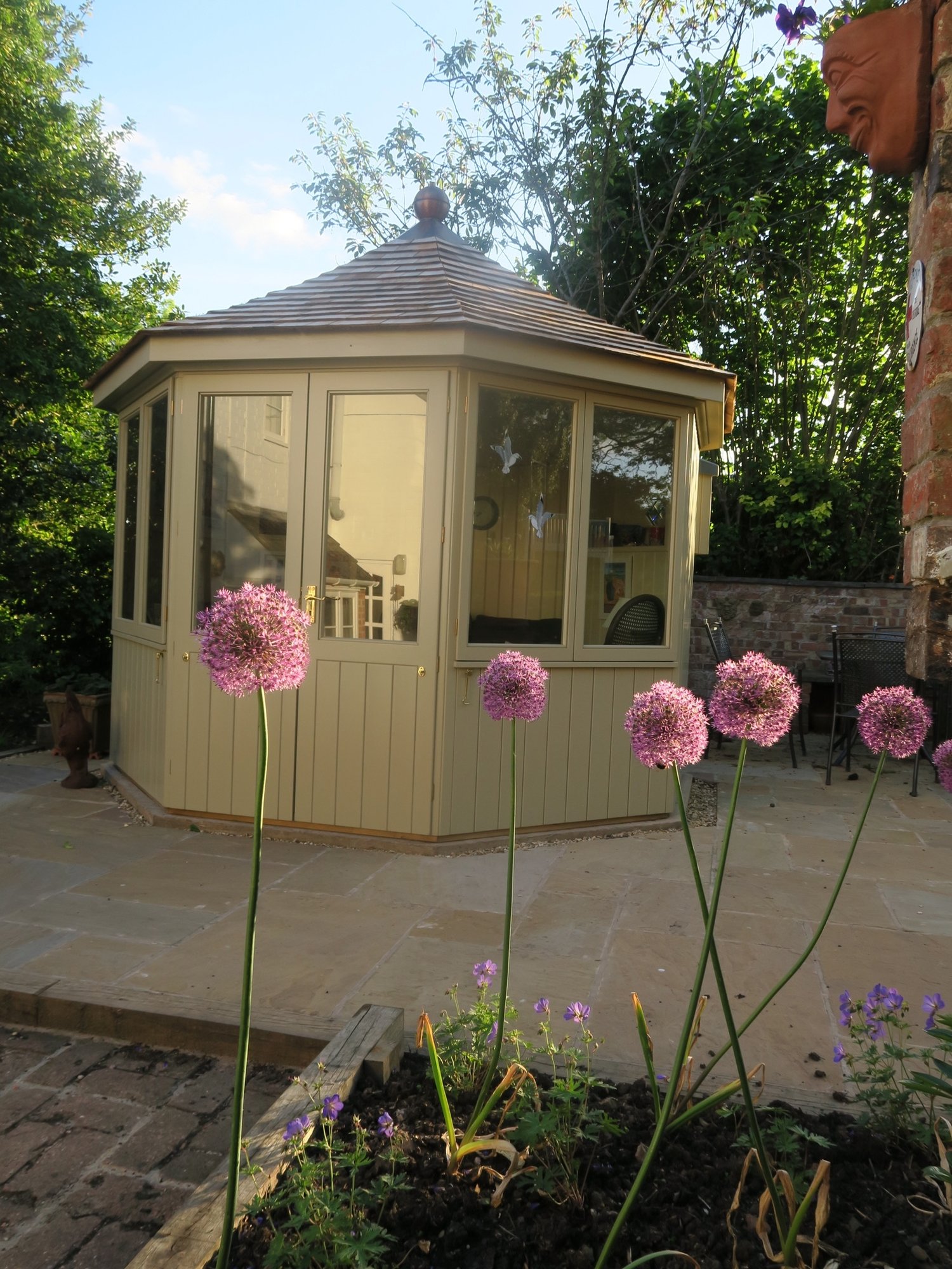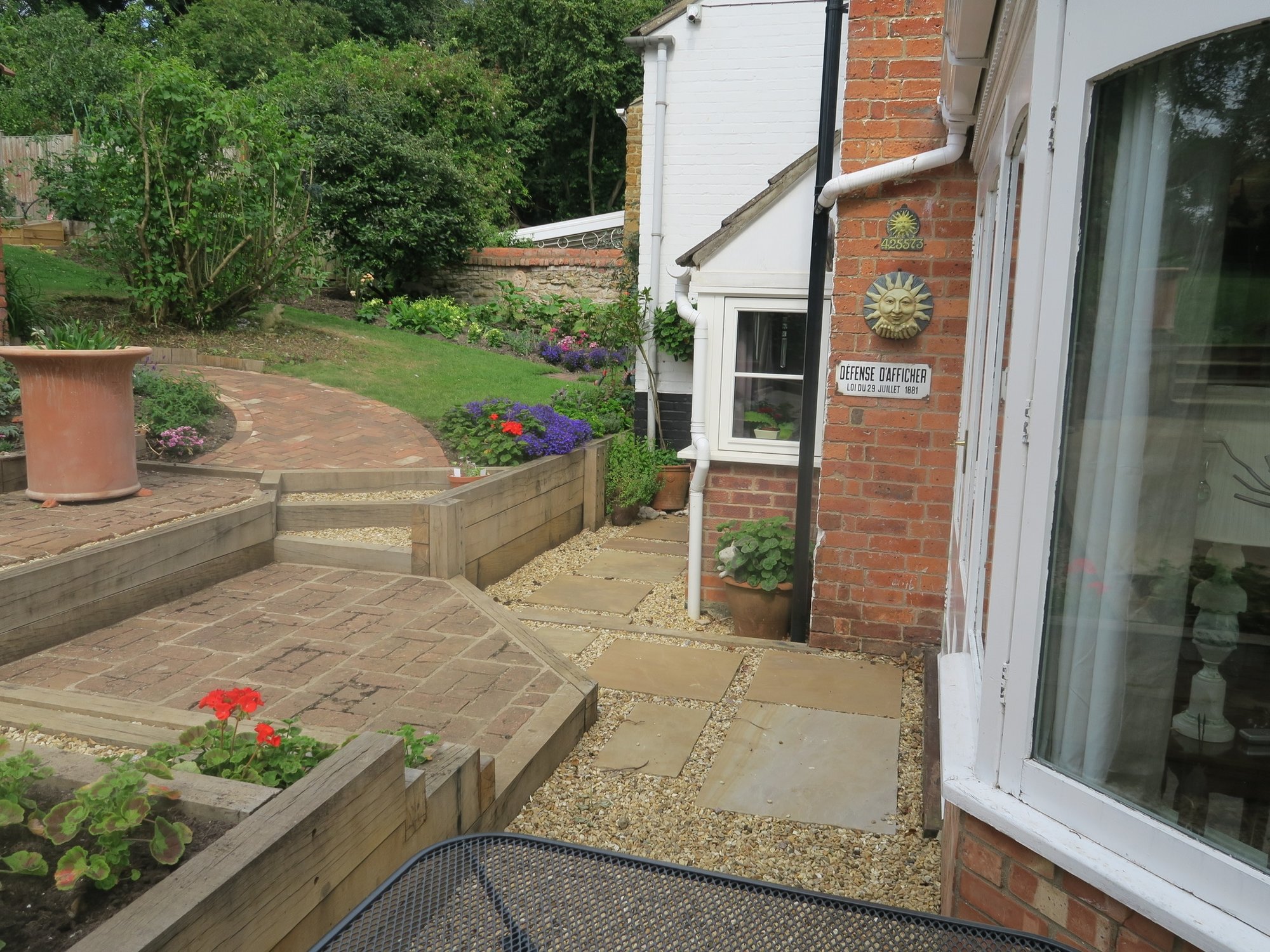 Our back garden was completely redesigned a year ago and the total bill was just shy of £25,000. For that we got a horrendously overgrown herbaceous border about 120’ x 12’ cleared and turfed. An overgrown vegetable garden cleared and replaced with raised beds and a cottage garden area. This patch of ground was about 50’ x 15’. An old garden pond filled in and a new one, 15’ x 13’, dug and positioned further from the silver birch trees and finally, a three level terrace was built incorporating a large, top of the range summerhouse from Scott’s of Thrapston, a new path to the back door and to the garden shed, and wide steps connecting the various levels. The terrace is mostly paved in natural yorkstone plus original materials were reused and incorporated. The terrace area is irregularly shaped and, like all the garden, on an awkward slope but to say it is maybe 30’ x 25’ gives you an idea of the extent.