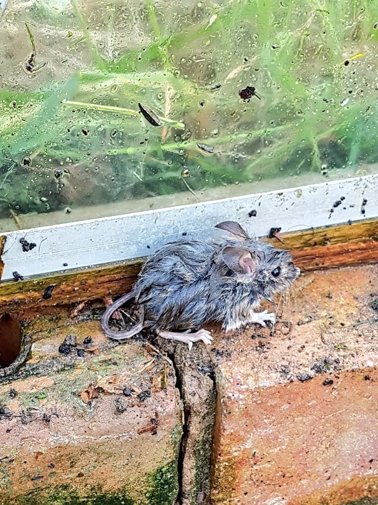 Mouse just sat and watched me as l emptied the greenhouse and refused to move even though, as you can see, everything got a good soaking.