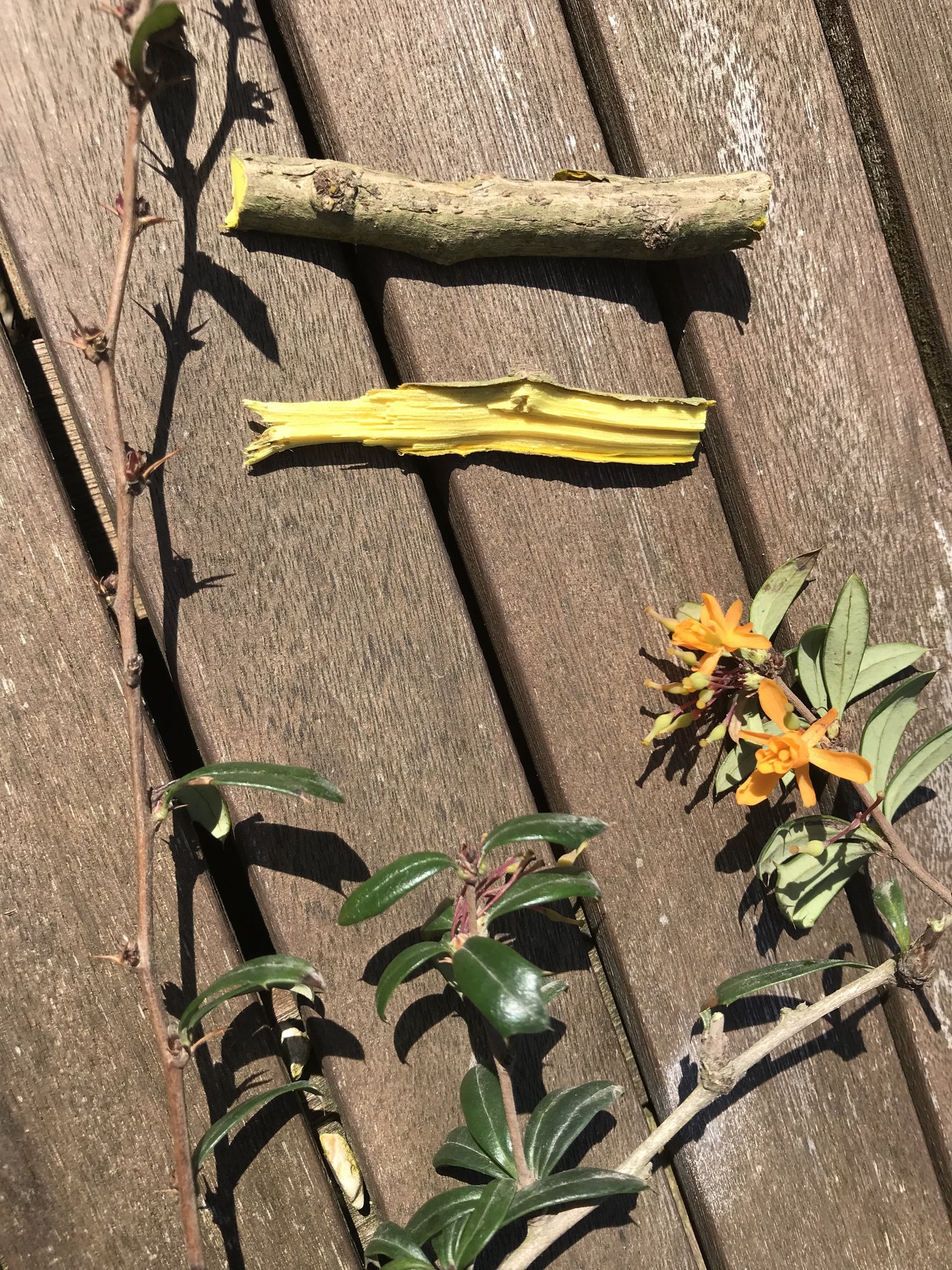 Does anyone know what this is? Extraordinary bright saffron yellow inside the bark, small dark green leaves and tiny orange flowers (1cm) a little like a narcissus. There’s a massive old trunk with loads of dead wood and I thought it was dead but I found this straggly bit alive! Its an Idle if Wight Garden 1 mile from the coast if that’s a help! 0