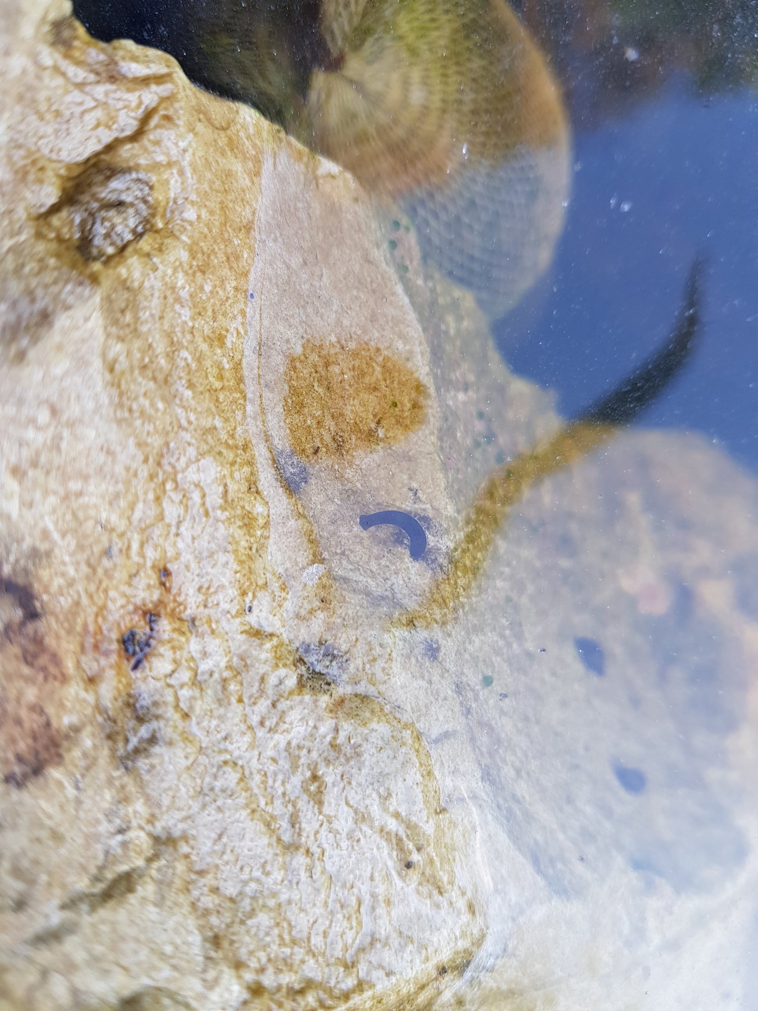 I'm asking about the long black thing, it's in the pond and usually just crawls all over the stone but is now swimming.