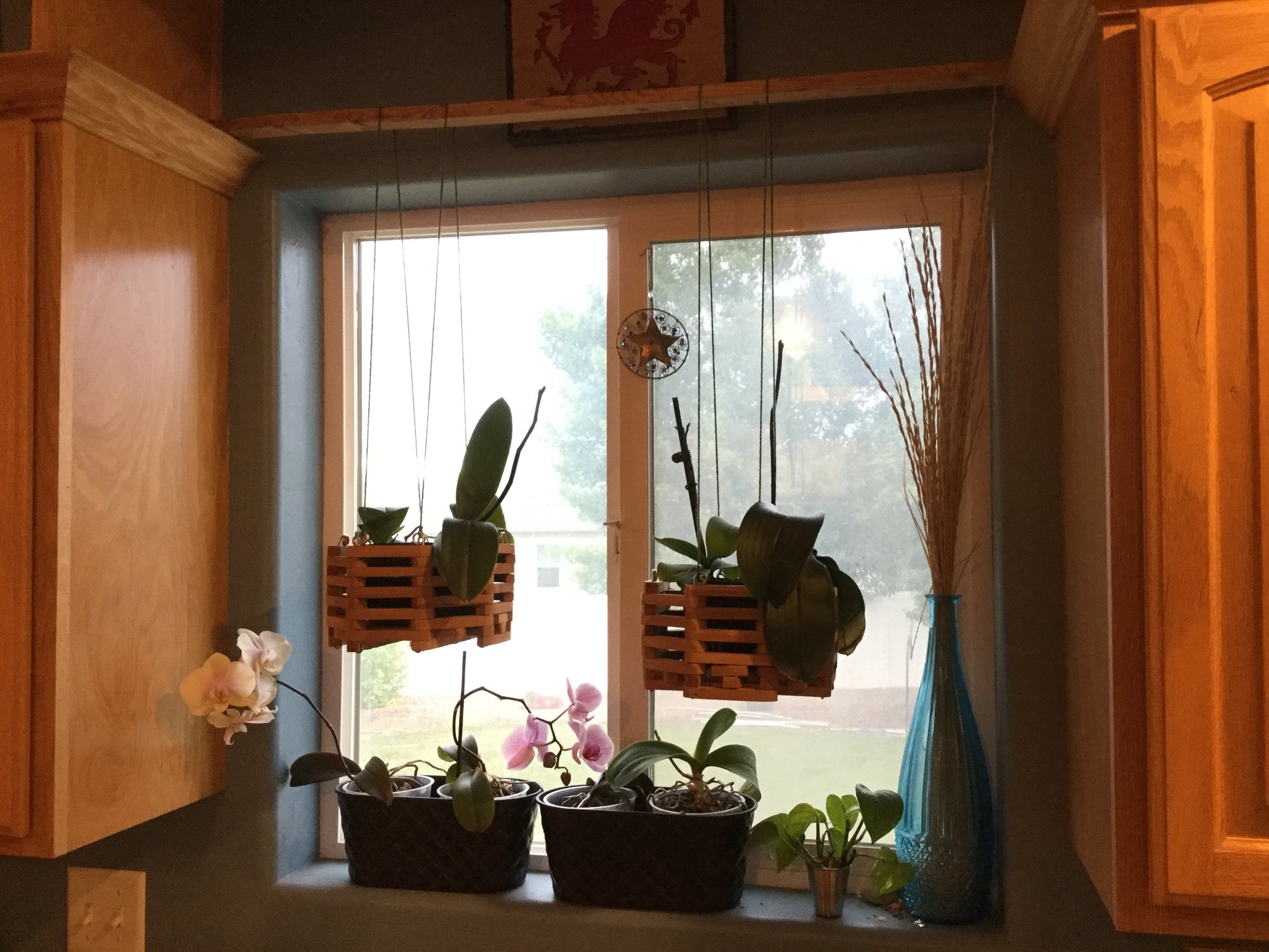 Not quite Wisley, yet. Certainly a few orchids closer though. It took longer than expected, as the slats in the wood baskets were too wide to keep the bark in.. so I had to then order some hydroponics baskets to go inside. I've taken cuttings of a philodendron to trail down from the top of the cupboards, eventually.